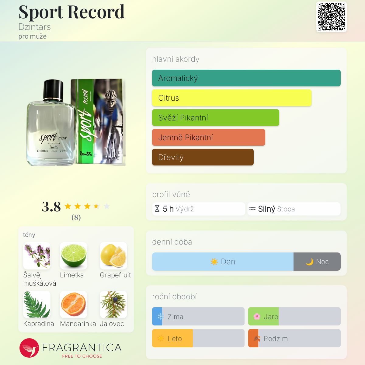 Sport Record podle Dzintars je Aromatic Fougere vůně pro muže. Sport Record byl/a uveden/a v roce 2010. Vrchní tóny jsou Limetka, Grapefruit a Mandarinka; střední tóny jsouŠalvěj muškátová, Kapradina, Jalovec a Bazalka ; základní tóny jsou Pižmo, Labdanum a Santalové dřevo.