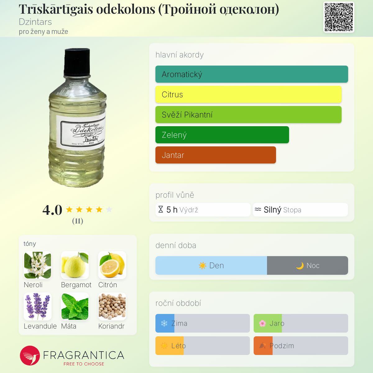 Trīskārtīgais odekolons (Тройной одеколон) podle Dzintars je Citrus vůně pro ženy a muže. Trīskārtīgais odekolons (Тройной одеколон) byl/a uveden/a v roce 1949. Vrchní tóny jsou Neroli, Bergamot a Citrón; střední tóny jsouLevandule, Máta a Koriandr ; základní tóny jsou Muškátový oříšek, Jantar (ambra) a Pižmo.