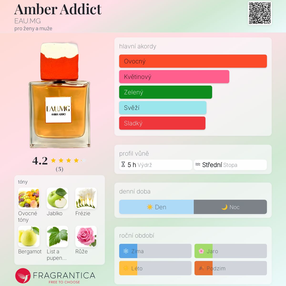 Amber Addict podle EAU.MG je Orientální vůně pro ženy a muže. Amber Addict byl/a uveden/a v roce 2023. Vrchní tóny jsou Ovoce, Jablko, Bergamot a Černý rybíz; střední tóny jsouFrézie a Růže ; základní tóny jsou Světlá dřeva, Pačuli, Vanilka, Jantar (ambra) a Pižmo.
