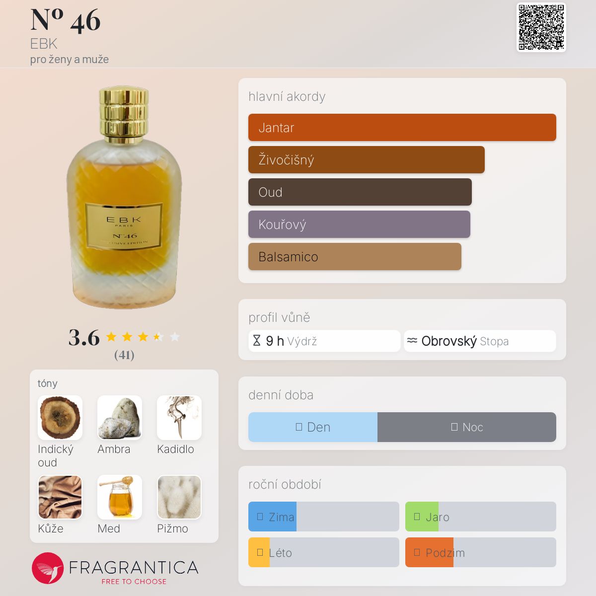 Nº 46 podle EBK je Leather vůně pro ženy a muže. Nº 46 byl/a uveden/a v roce 2021. Vrchní tóny jsou Med, Citrón a Jasmín; střední tóny jsouPižmo, Pačuli a Marshamallow ; základní tóny jsou Indický oud, Ambra, Kadidlo a Kůže.