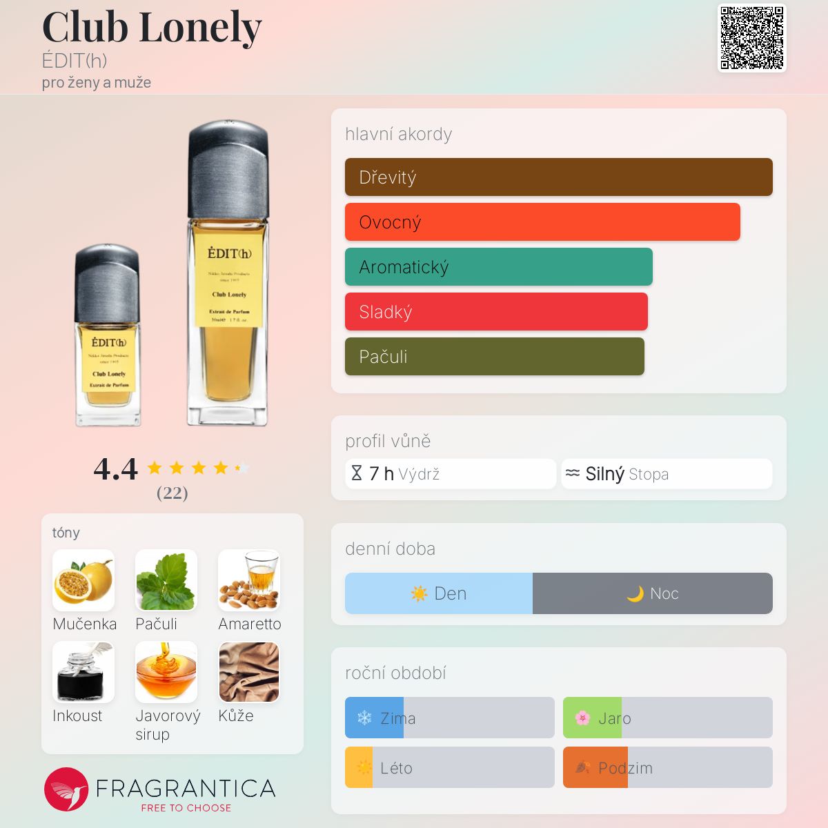 Club Lonely podle ÉDIT(h) je vůně pro ženy a muže. Club Lonely byl/a uveden/a v roce 2022. Vrchní tóny jsou Mučenka, Amaretto, Inkoust, Javorový sirup a Černý rybíz; střední tóny jsouPačuli, Jasmín a Konvalinka ; základní tóny jsou Kůže, Cedr a Santalové dřevo.