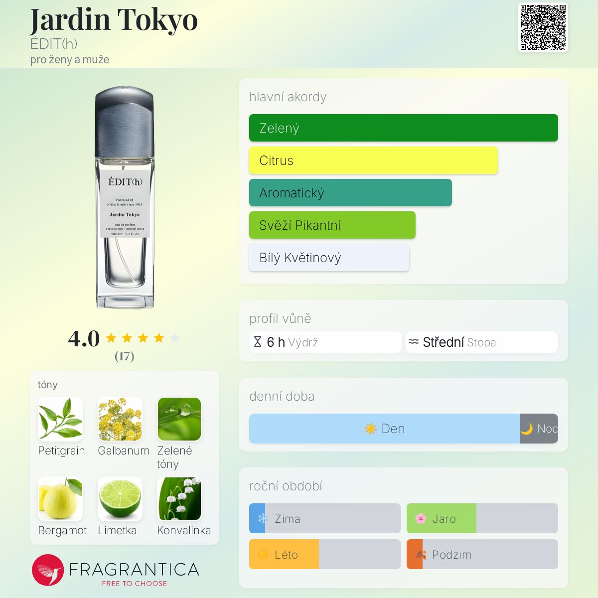 Jardin Tokyo podle ÉDIT(h) je Aromatic Green vůně pro ženy a muže. Jardin Tokyo byl/a uveden/a v roce 2020. Vrchní tóny jsou Petitgrain, Bergamot a Limetka; střední tóny jsouGalbanum, Zelené tóny a Konvalinka ; základní tóny jsou Bylinné tóny a Pižmo.
