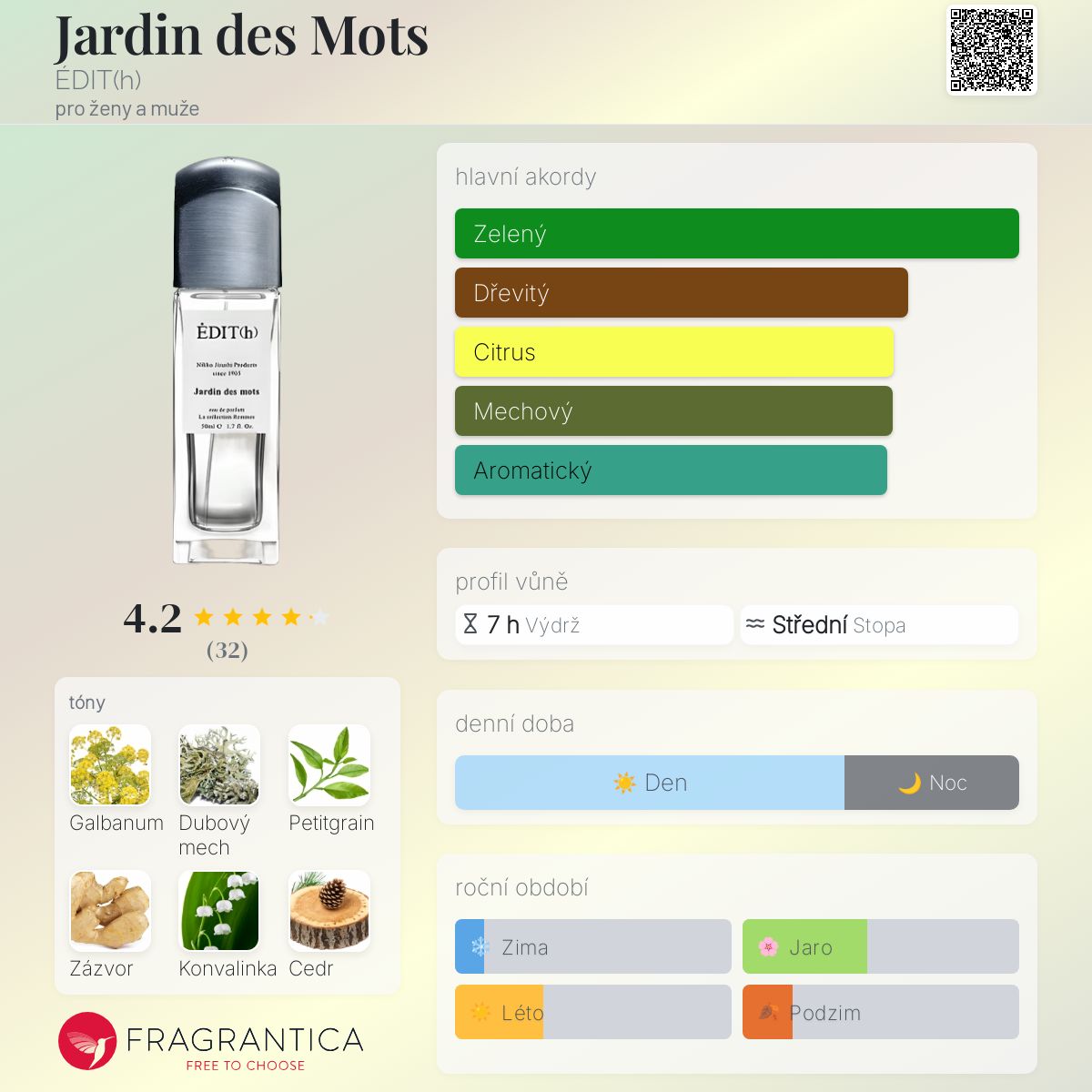 Jardin des Mots podle ÉDIT(h) je Floral Green vůně pro ženy a muže. Jardin des Mots byl/a uveden/a v roce 2021. "Nosem" za touto vůní je Alexandra Carlin. Vrchní tóny jsou Galbanum, Petitgrain, Zázvor, Bergamot a Mandarinka; střední tóny jsouKonvalinka, Bergamot a Růže ; základní tóny jsou Mech, Extrakt z bílého cedru a Bílé pižmo.