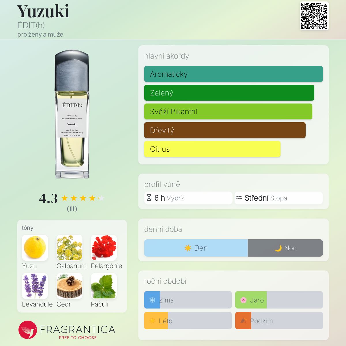 Yuzuki podle ÉDIT(h) je Citrus Aromatic vůně pro ženy a muže. Yuzuki byl/a uveden/a v roce 2020. Vrchní tóny jsou Yuzu a Galbanum; střední tóny jsouPelargónie, Levandule a Konvalinka ; základní tóny jsou Cedr, Pačuli a Santalové dřevo.