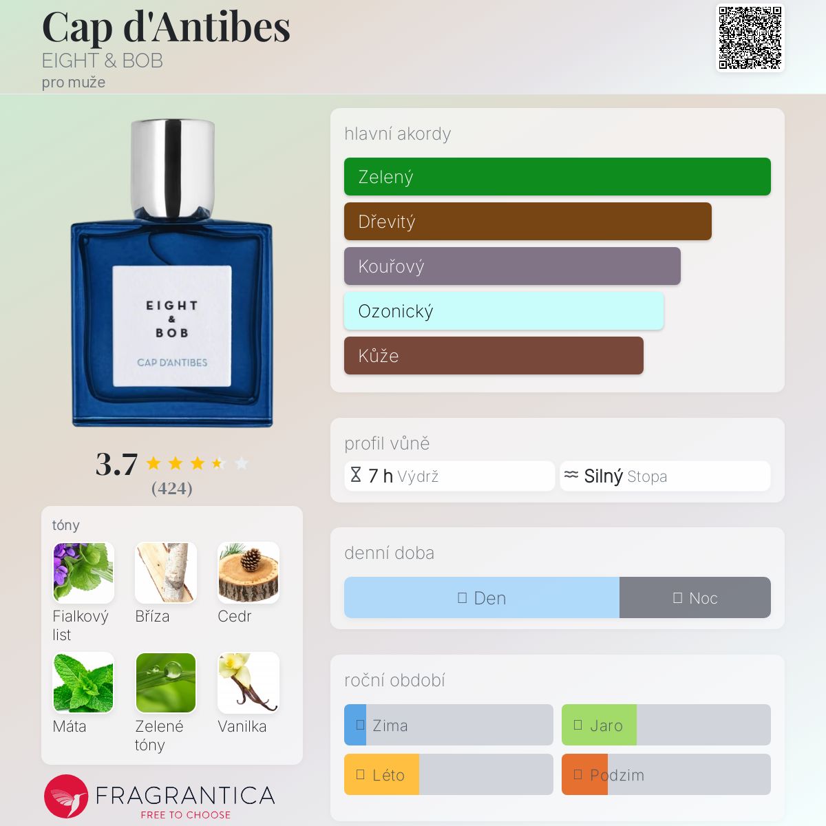 Cap d'Antibes podle EIGHT & BOB je Aromatic vůně pro muže. Cap d'Antibes byl/a uveden/a v roce 2014. Vrchní tóny jsou Fialkový list, Bříza a Máta; střední tóny jsouZelené tóny, Mech a Skořice ; základní tóny jsou Cedr, Vanilka a Kadidlo.