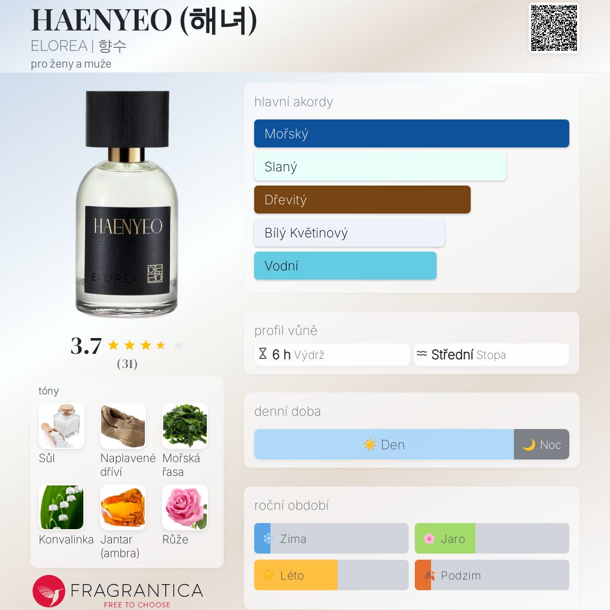 HAENYEO (해녀) podle ELOREA | 향수 je Floral Aquatic vůně pro ženy a muže. Toto je nová vůně. HAENYEO (해녀) byl/a uveden/a v roce 2024. Vrchní tóny jsou Mořská sůl, Mořská řasa a Růžový pepř; střední tóny jsouKonvalinka, Růže a Kosatec ; základní tóny jsou Naplavené dříví a Jantar (ambra).