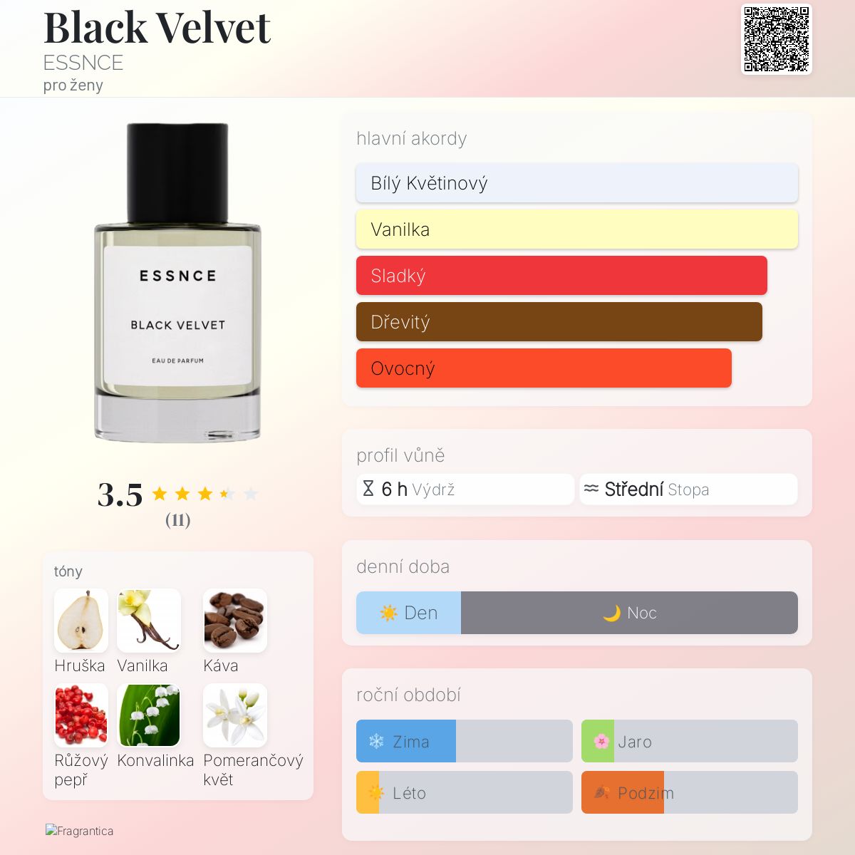 Black Velvet podle ESSNCE je Orientální Vanilla vůně pro ženy. Black Velvet byl/a uveden/a v roce 2023. Vrchní tóny jsou Hruška, Káva a Růžový pepř; střední tóny jsouKonvalinka, Pomerančový květ a Jasmín ; základní tóny jsou Vanilka, Santalové dřevo, Pačuli, Cedr a Jantar (ambra).