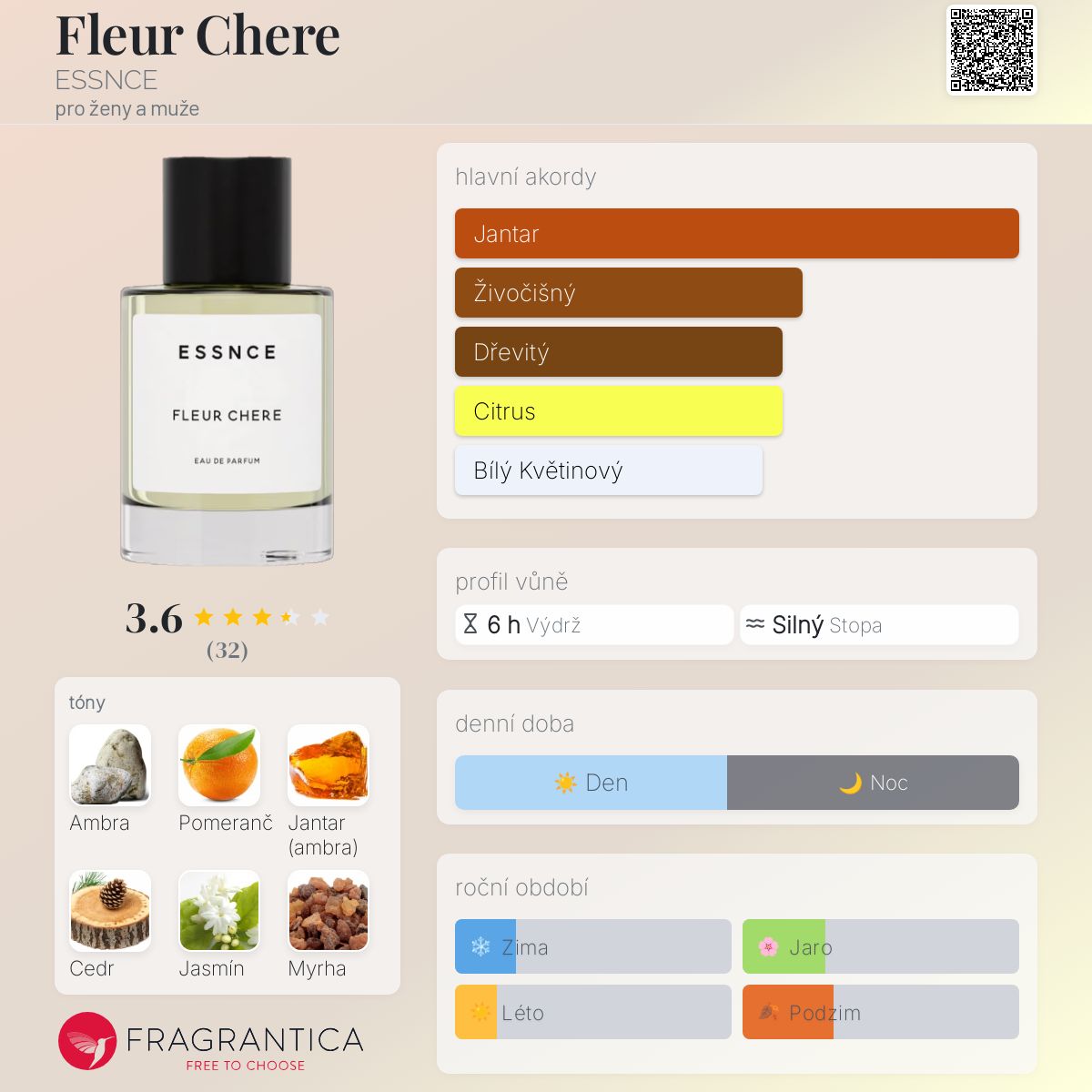Fleur Chere podle ESSNCE je Woody Spicy vůně pro ženy a muže. Fleur Chere byl/a uveden/a v roce 2023. Vrchní tóny jsou Pomeranč a Jasmín; střední tóny jsouAmbra, Jantar (ambra) a Myrha ; základní tóny jsou Cedr a Vanilka.