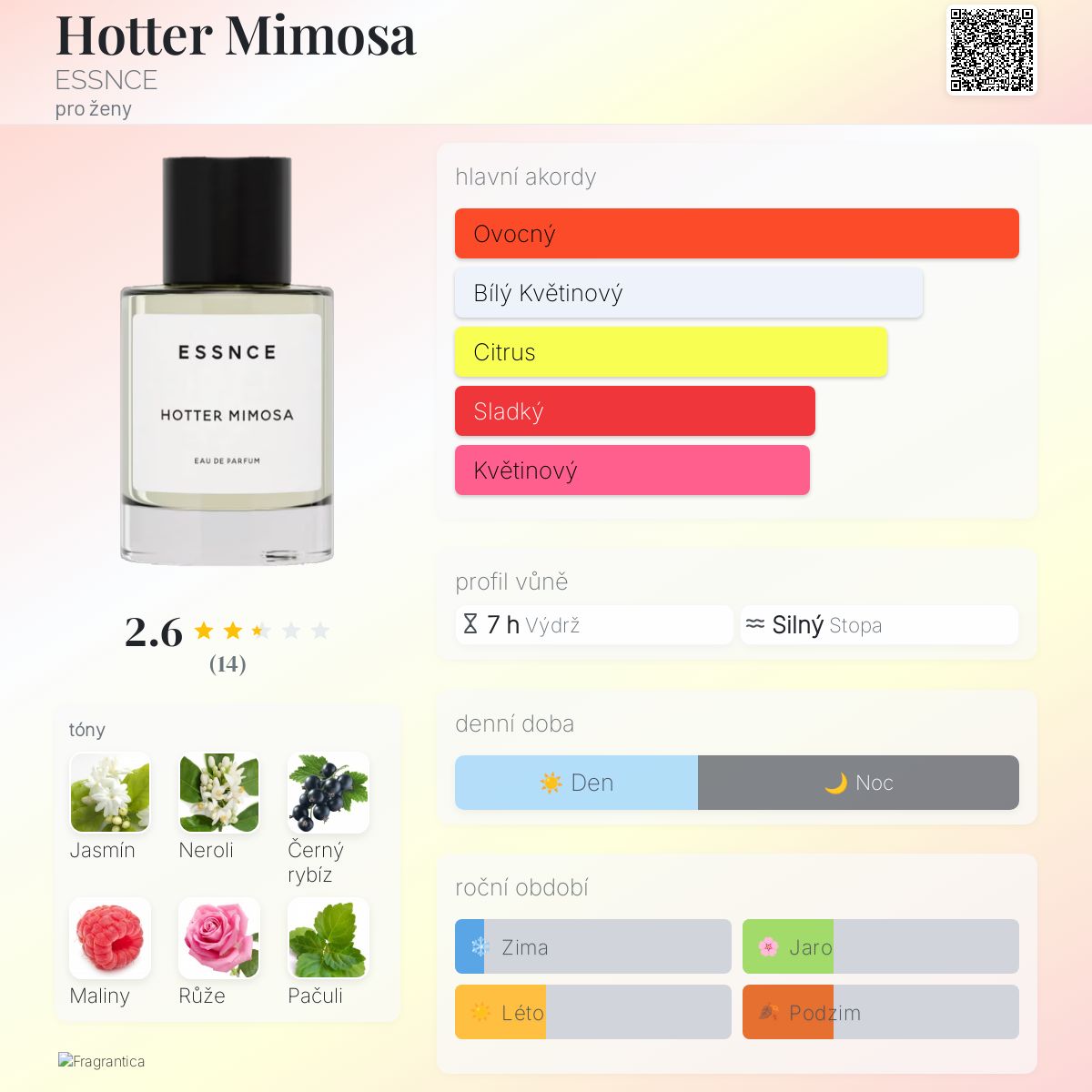 Hotter Mimosa podle ESSNCE je Chypre Floral vůně pro ženy. Hotter Mimosa byl/a uveden/a v roce 2023. Vrchní tóny jsou Černý rybíz, Zelené jablko, Hruška, Bergamot a Mandarinka; střední tóny jsouJasmín, Neroli, Maliny a Růže ; základní tóny jsou Pačuli, Vanilka, Pižmo a Jantar (ambra).