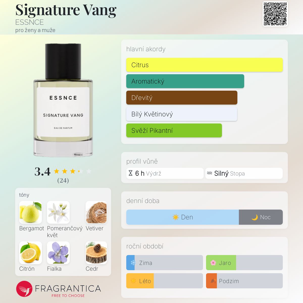 Signature Vang podle ESSNCE je Orientální Woody vůně pro ženy a muže. Signature Vang byl/a uveden/a v roce 2023. Vrchní tóny jsou Bergamot, Pomerančový květ, Citrón, Měsíček a Černý rybíz; střední tóny jsouFialka, Jasmín a Brambořík ; základní tóny jsou Vetiver, Cedr, Jantar (ambra) a Pižmo.