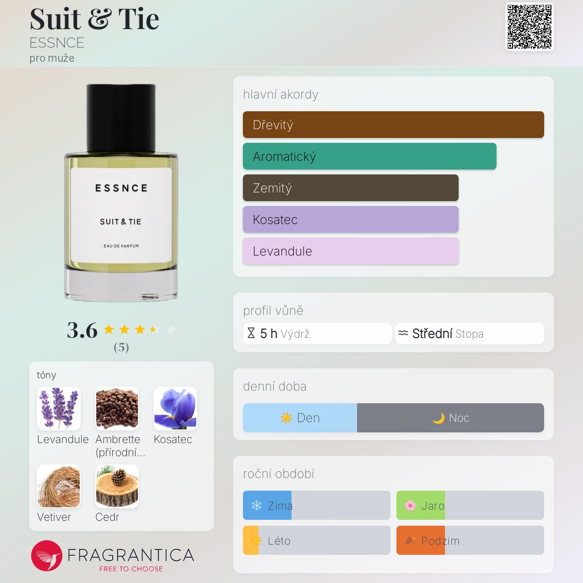 Suit & Tie podle ESSNCE je Woody Aromatic vůně pro muže. Vrchní tón je Levandule ; střední tóny jsouAmbrette (přírodní pižmo) a Kosatec ; základní tóny jsou Vetiver a Cedr.