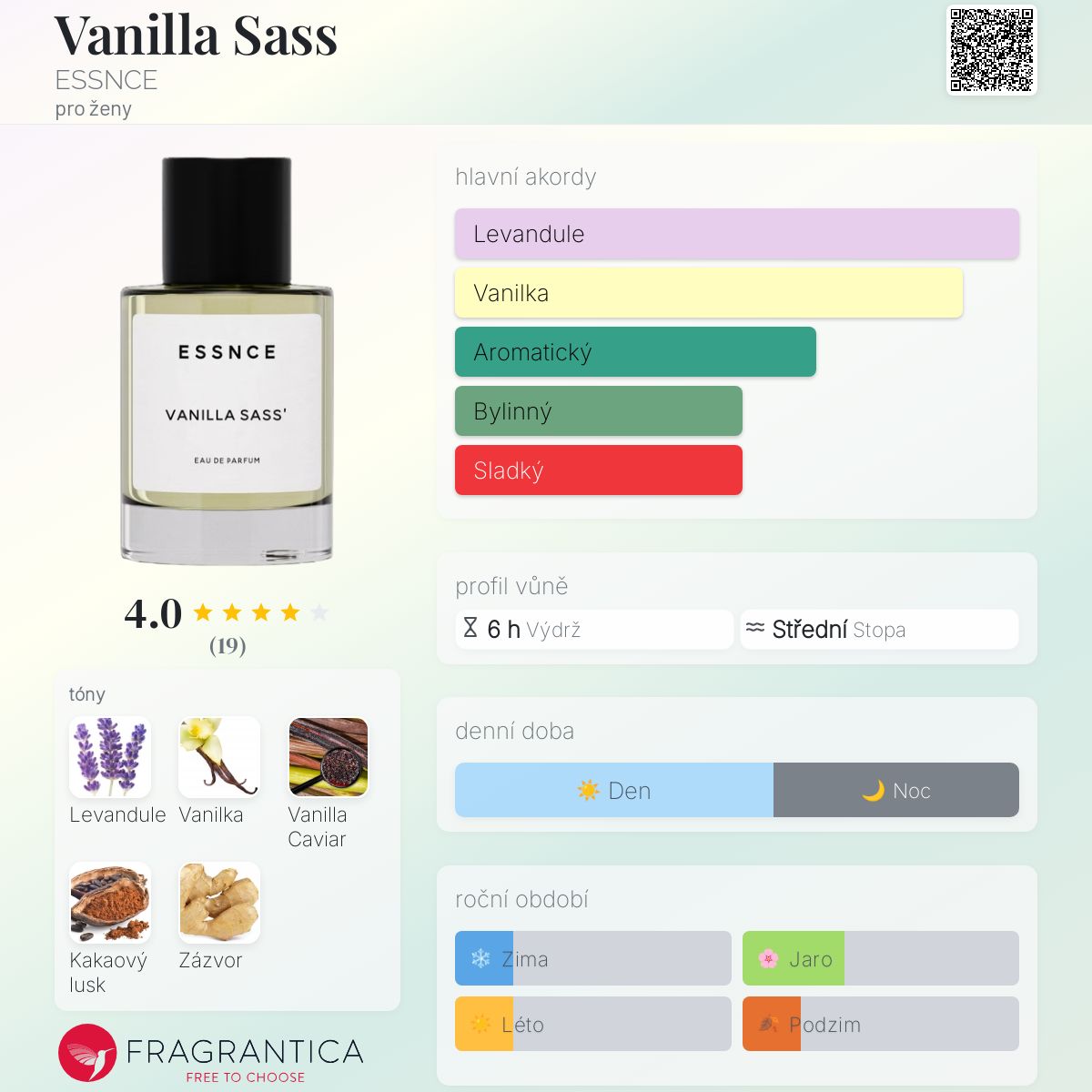Vanilla Sass podle ESSNCE je Orientální Vanilla vůně pro ženy. Vrchní tóny jsou Levandule, Vanilka a Kakao; střední tóny jsouKaviár z vanilky a Zázvor ; základní tón je Vanilka.