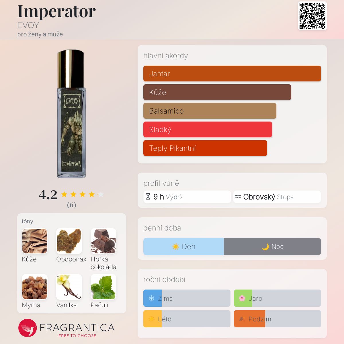 Imperator podle EVOY je Orientální vůně pro ženy a muže. Imperator byl/a uveden/a v roce 2020. "Nosem" za touto vůní je Tatiana Naumova. Vrchní tóny jsou Kůže, Hořká čokoláda, Vanilka a Mandarinka; střední tóny jsouPačuli a Kosatec ; základní tóny jsou Opoponax, Myrha, Ambra, Dubový mech, Santalové dřevo a Benzoin.