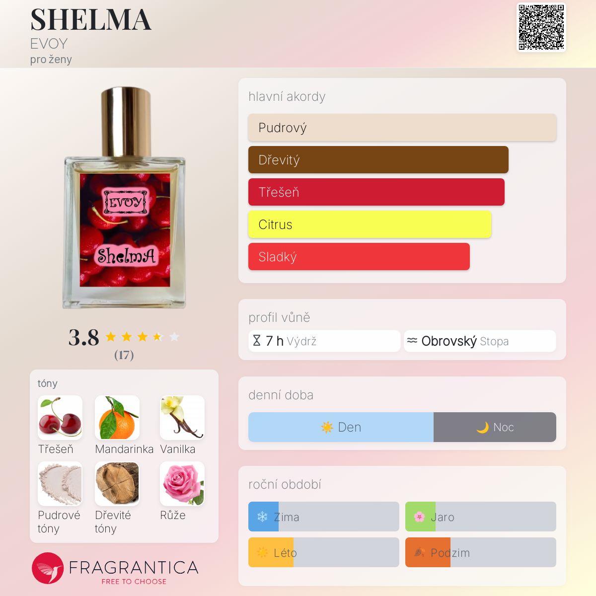 SHELMA podle EVOY je vůně pro ženy. SHELMA byl/a uveden/a v roce 2018. "Nosem" za touto vůní je Tatiana Naumova. Vrchní tóny jsou Třešeň, Mandarinka, Francouzská růže a Šampaňské; střední tóny jsouPudrové tóny, Kosatec a Lilie ; základní tóny jsou Vanilka, Dřevité tóny, Santalové dřevo a Pižmo.