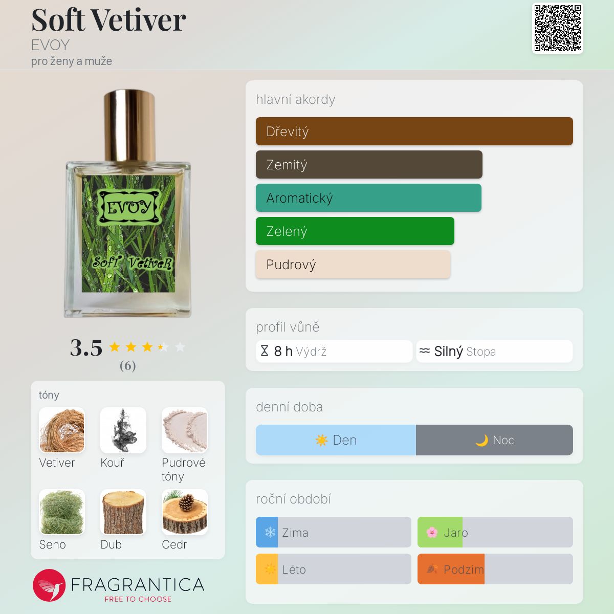 Soft Vetiver podle EVOY je vůně pro ženy a muže. Soft Vetiver byl/a uveden/a v roce 2019. "Nosem" za touto vůní je Tatiana Naumova. Vrchní tóny jsou Vetiver, Pudrové tóny, Krvavý pomeranč a Bergamot; střední tóny jsouKouř, Seno a Kosatec ; základní tóny jsou Vetiver, Dub, Cedr, Pačuli a Santalové dřevo.