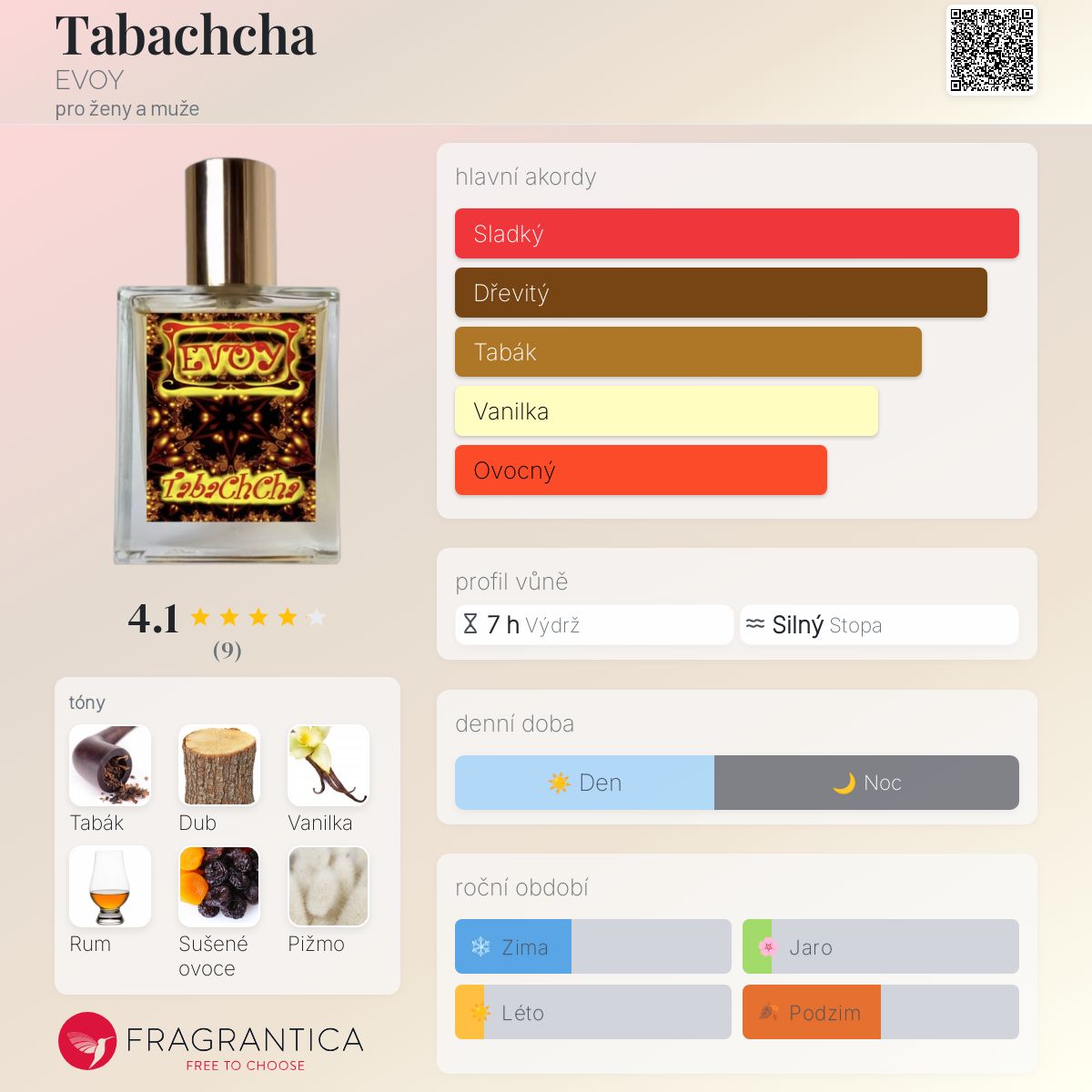 Tabachcha podle EVOY je Orientální Spicy vůně pro ženy a muže. Tabachcha byl/a uveden/a v roce 2019. "Nosem" za touto vůní je Tatiana Naumova. Vrchní tóny jsou Tabák, Sušené ovoce a Grapefruit; střední tóny jsouRum, Sirup a Růže ; základní tóny jsou Dub, Vanilka a Pižmo.