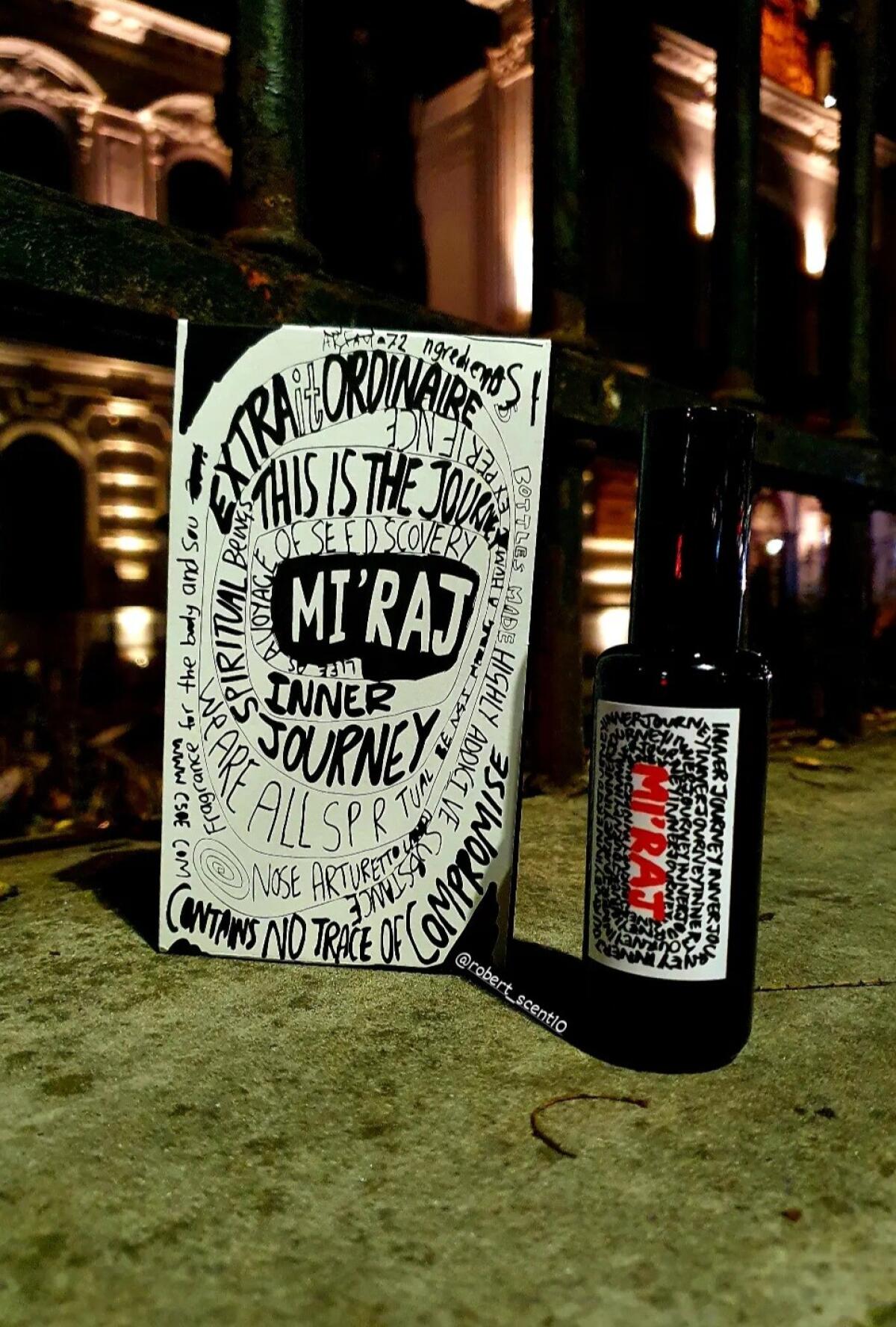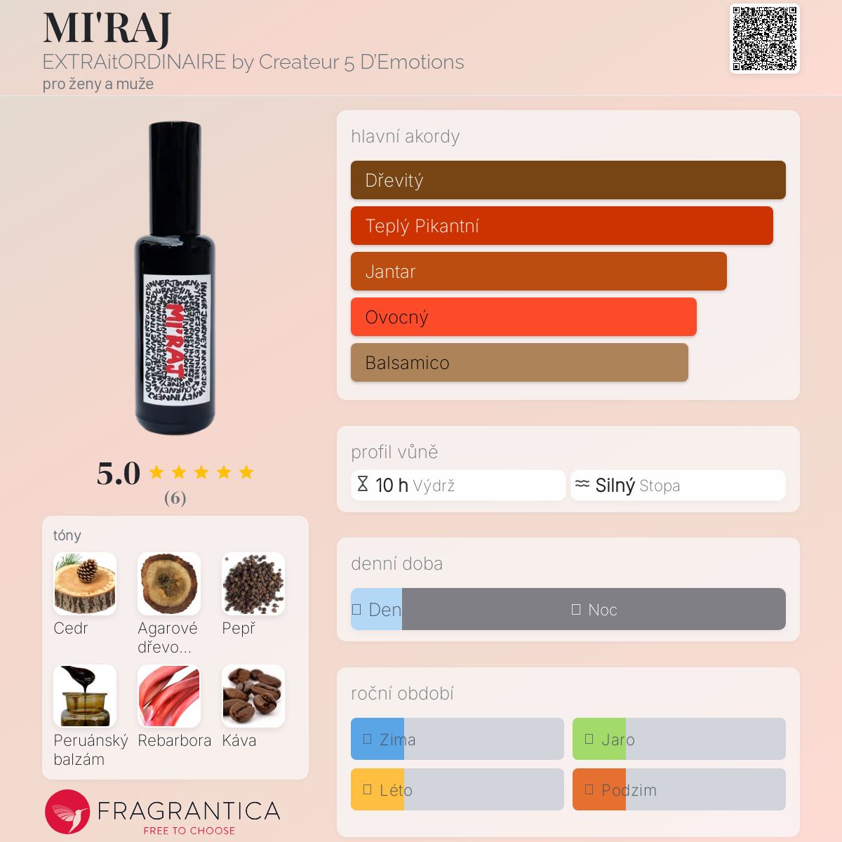 MI'RAJ podle EXTRAitORDINAIRE by Createur 5 D’Emotions je Orientální vůně pro ženy a muže. MI'RAJ byl/a uveden/a v roce 2018. "Nosem" za touto vůní je Arturetto Landi. Vrchní tóny jsou Pepř, Rebarbora, Káva, Jahoda, Karamel, Kardamom, Skořice, Švestka, Šafrán, Konopí, Máslo, Mango a Broskev; střední tóny jsouKosatec, Růže, Jasmín, Pelargónie, Med a Mléko ; základní tóny jsou Cedr, Agarové dřevo (oud), Peruánský balzám, Balzám Tolu, Pačuli, Ambra, Cibetka, Dubový mech, Vanilka, Santalové dřevo, Cypriolový olej a Chrpovník lopuchový.