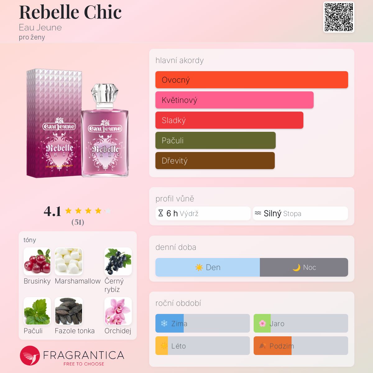 Rebelle Chic podle Eau Jeune je Chypre Fruity vůně pro ženy. Rebelle Chic byl/a uveden/a v roce 2009. "Nosem" za touto vůní je Christophe Raynaud. Vrchní tóny jsou Brusinky, Černý rybíz a Bergamot; střední tóny jsouOrchidej, Pivoňka, Lotus a Frézie ; základní tóny jsou Marshmallow, Pačuli, Fazole tonka a Vanilka.