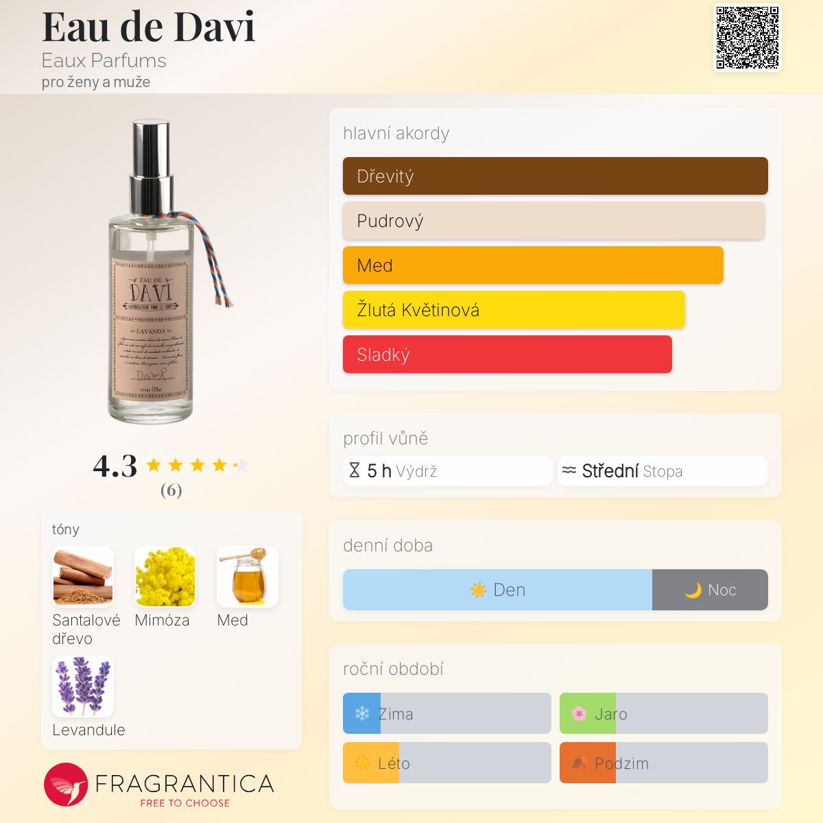 Eau de Davi podle Eaux Parfums je Aromatic Fougere vůně pro ženy a muže. Eau de Davi byl/a uveden/a v roce 2015. "Nosem" za touto vůní je Leonora Nogueira.