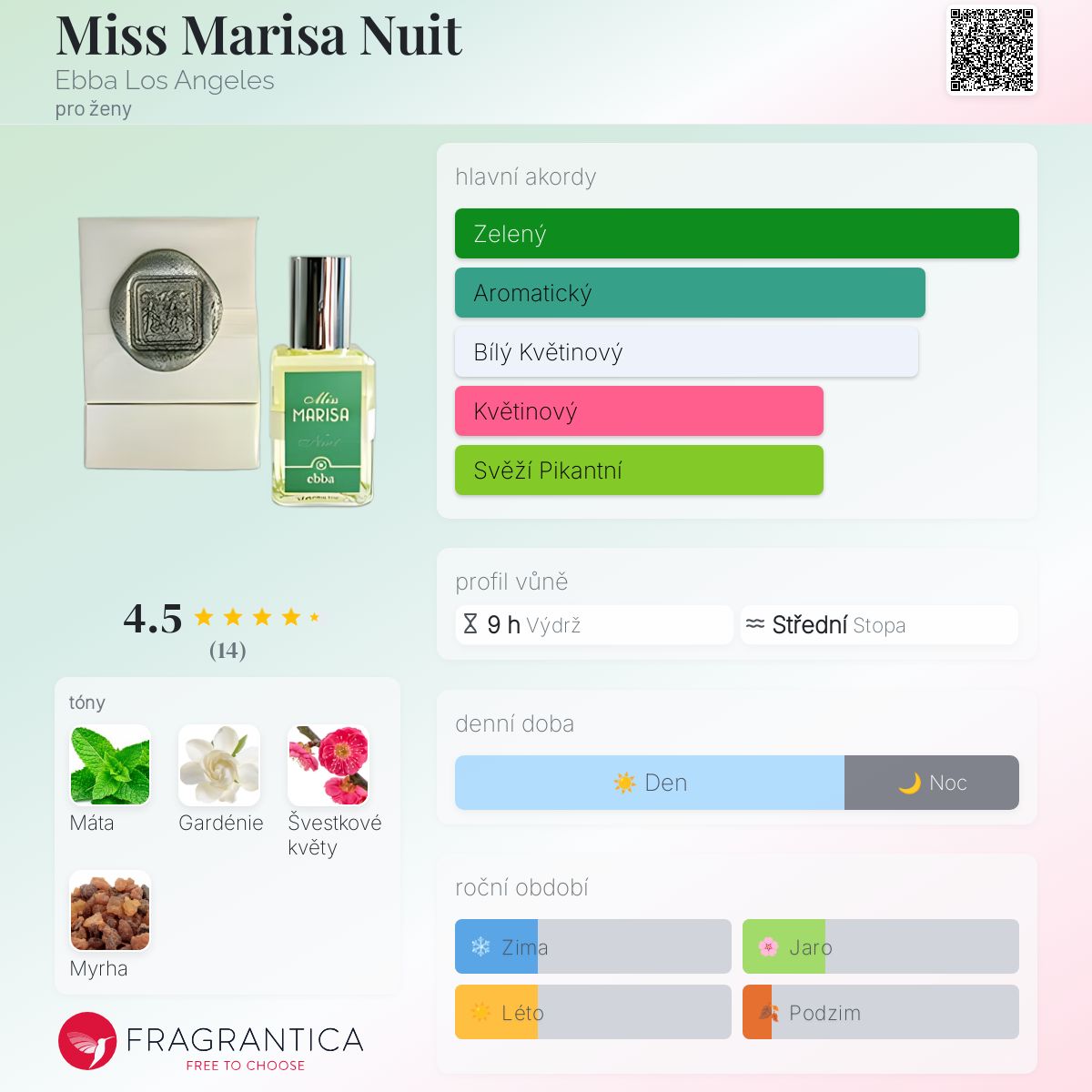 Miss Marisa Nuit podle Ebba Los Angeles je Floral Aquatic vůně pro ženy. Miss Marisa Nuit byla spuštěna během 2000. "Nosem" za touto vůní je Viktoria Fisch.