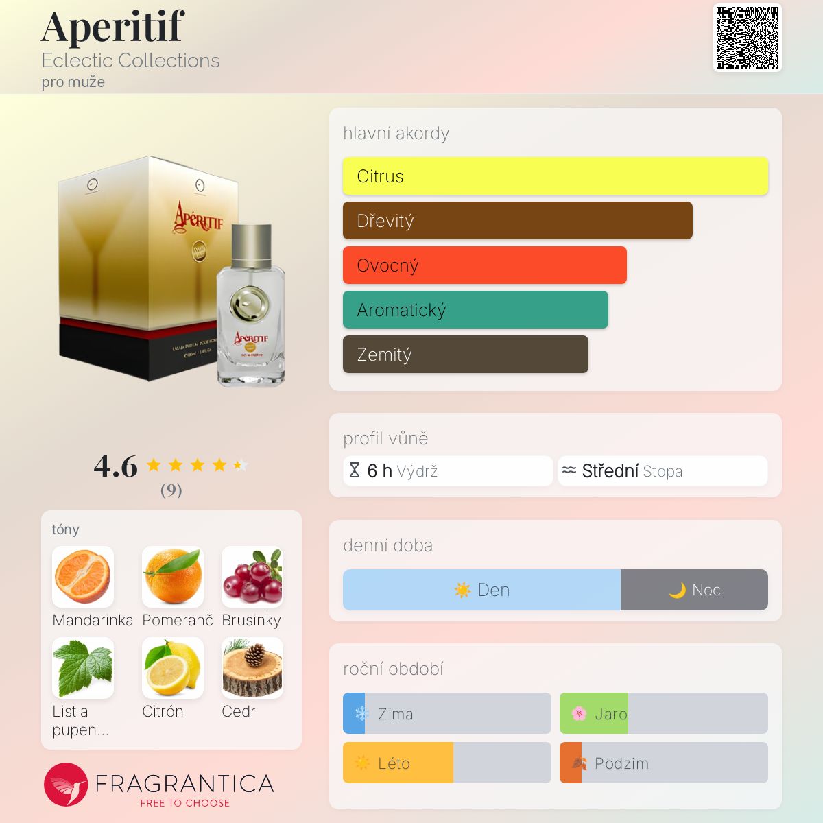 Aperitif podle Eclectic Collections je Aromatic Fruity vůně pro muže. Aperitif byl/a uveden/a v roce 2011. Vrchní tóny jsou Mandarinka, Pomeranč a Brusinky; střední tón jeČerný rybíz ; základní tóny jsou Citron amalfi , Cedr, Dubový mech, Santalové dřevo, Francouzské labdanum a Vetiver.