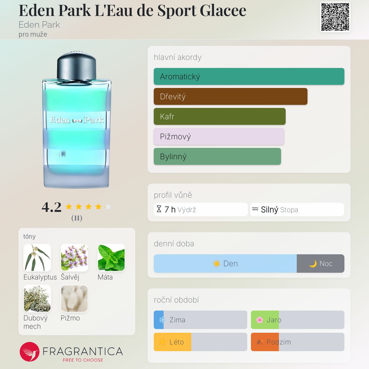 Eden Park L'Eau de Sport Glacee podle Eden Park je Aromatic Aquatic vůně pro muže. Eden Park L'Eau de Sport Glacee byl/a uveden/a v roce 2008. Vrchní tóny jsou Eukalyptus a Máta; střední tón jeŠalvěj ; základní tóny jsou Dubový mech a Pižmo.