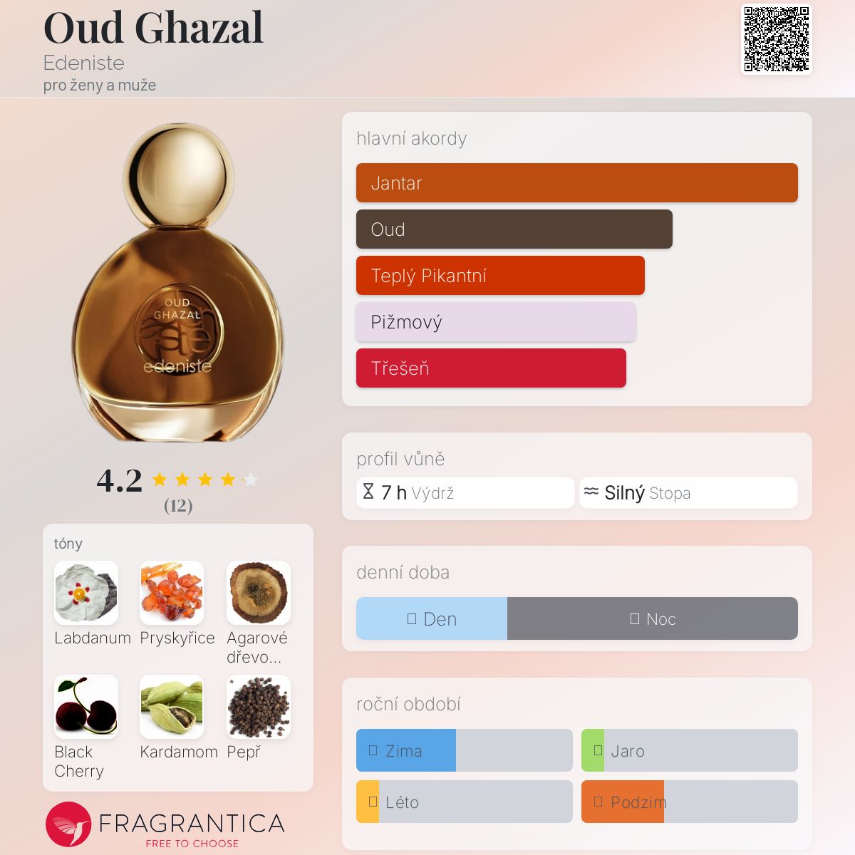 Oud Ghazal podle Edeniste je Woody Spicy vůně pro ženy a muže. Toto je nová vůně. Oud Ghazal byl/a uveden/a v roce 2024. Vrchní tóny jsou Kardamom, Pepř a Černá třešeň; střední tóny jsouPryskyřice, Labdanum a Agarové dřevo (oud) ; základní tóny jsou Pižmo, Vetiver a Cedr.