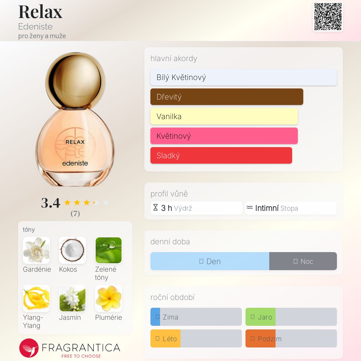 Relax podle Edeniste je Floral vůně pro ženy a muže. Relax byl/a uveden/a v roce 2022. Relax byl/a vytvořen/a Aurélien Guichard a Jérôme di Marino. Vrchní tóny jsou Gardénie, Kokos a Zelené tóny; střední tóny jsouYlang-Ylang, Jasmín a Plumérie ; základní tóny jsou Vanilka, Pižmo, Jantar (ambra) a Cedr.