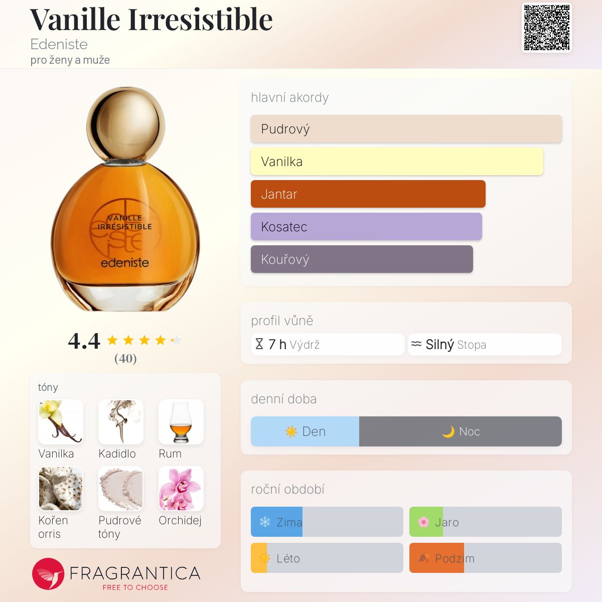 Vanille Irresistible podle Edeniste je vůně pro ženy a muže. Vanille Irresistible byl/a uveden/a v roce 2022. Vanille Irresistible byl/a vytvořen/a Aurélien Guichard a Jérôme di Marino. Vrchní tóny jsou Kadidlo, Rum a Bergamot; střední tóny jsouOrris, Pudrové tóny a Orchidej ; základní tóny jsou Vanilka, Vanilka, Pačuli a Vetiver.