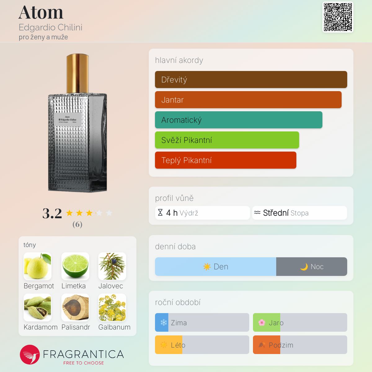Atom podle Edgardio Chilini je vůně pro ženy a muže. Atom byl/a uveden/a v roce 2016. "Nosem" za touto vůní je Sergey Karov. Vrchní tóny jsou Bergamot, Limetka, Jalovec a Kardamom; střední tóny jsouPalisandr, Galbanum, Kadidlo, Iso E Super, Růže a Pelargónie ; základní tóny jsou Styrax, Vanilka, Santalové dřevo, Pižmo, Jantar (ambra) a Dubový mech.
