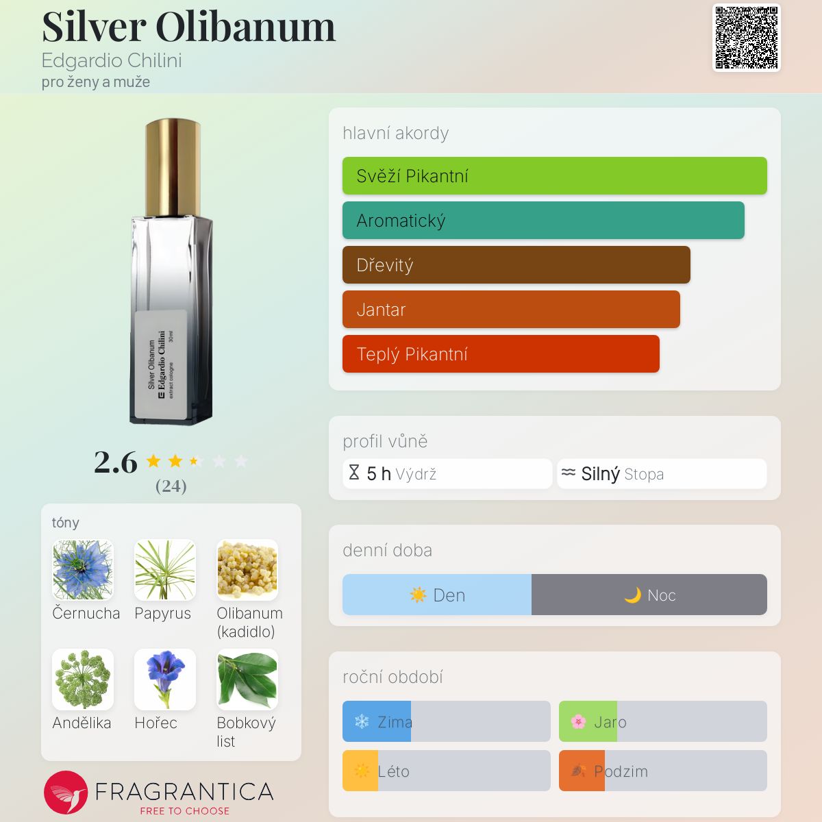 Silver Olibanum podle Edgardio Chilini je Orientální Spicy vůně pro ženy a muže. Silver Olibanum byl/a uveden/a v roce 2012. "Nosem" za touto vůní je Sergey Karov. Vrchní tóny jsou Černucha, Papyrus, Andělika, Hořec, Bobkový list, Sedmikráska, Meduňka, Galanga kořen, Kopr, Černý pepř, Tymián, Bazalka, Amaretto, Bílý med, Rozmarýn, Gardénie, Petitgrain, Šalvěj, Pomeranč, Mandarinka, Zázvor, Bergamot, Neroli, Pelargónie, Hořká mandle, Ananas a Máta; střední tóny jsouBřezová smola, Kardamom, Pelyněk, Hřebíček, Šafrán, Levandule, Kosatec, Jedle, Myrta, Damašská růže, Marocká růže, Muškátový oříšek, Bourbonské geránium , Růžový pepř, Kasie a Jasmín ; základní tóny jsou Olibanum, Jantar (ambra), Vetiver, Agarové dřevo (oud), Labdanum, Tabák, Hořká čokoláda, Dubový mech, Kašmírové dřevo, Kůže, Benzoin, Karamel, Balzám Tolu, Pačuli, Kastoreum, Borovice, Cedr, Styrax, Santalové dřevo, Fazole tonka, Vanilka a Pižmo.