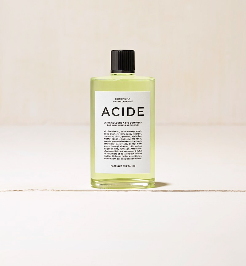 Acide podle Editions M. R. je Citrus Aromatic vůně pro muže. Acide byl/a uveden/a v roce 2018. "Nosem" za touto vůní je Will Inrig. Vrchní tóny jsou Sicilský citron, Bergamot, Koňak, Neroli, Saturejka a Petitgrain; střední tóny jsouKozlík lékařský, Levandule, Brambořík a Fialkový list ; základní tóny jsou Pačuli, Dubový mech a Kumarin.