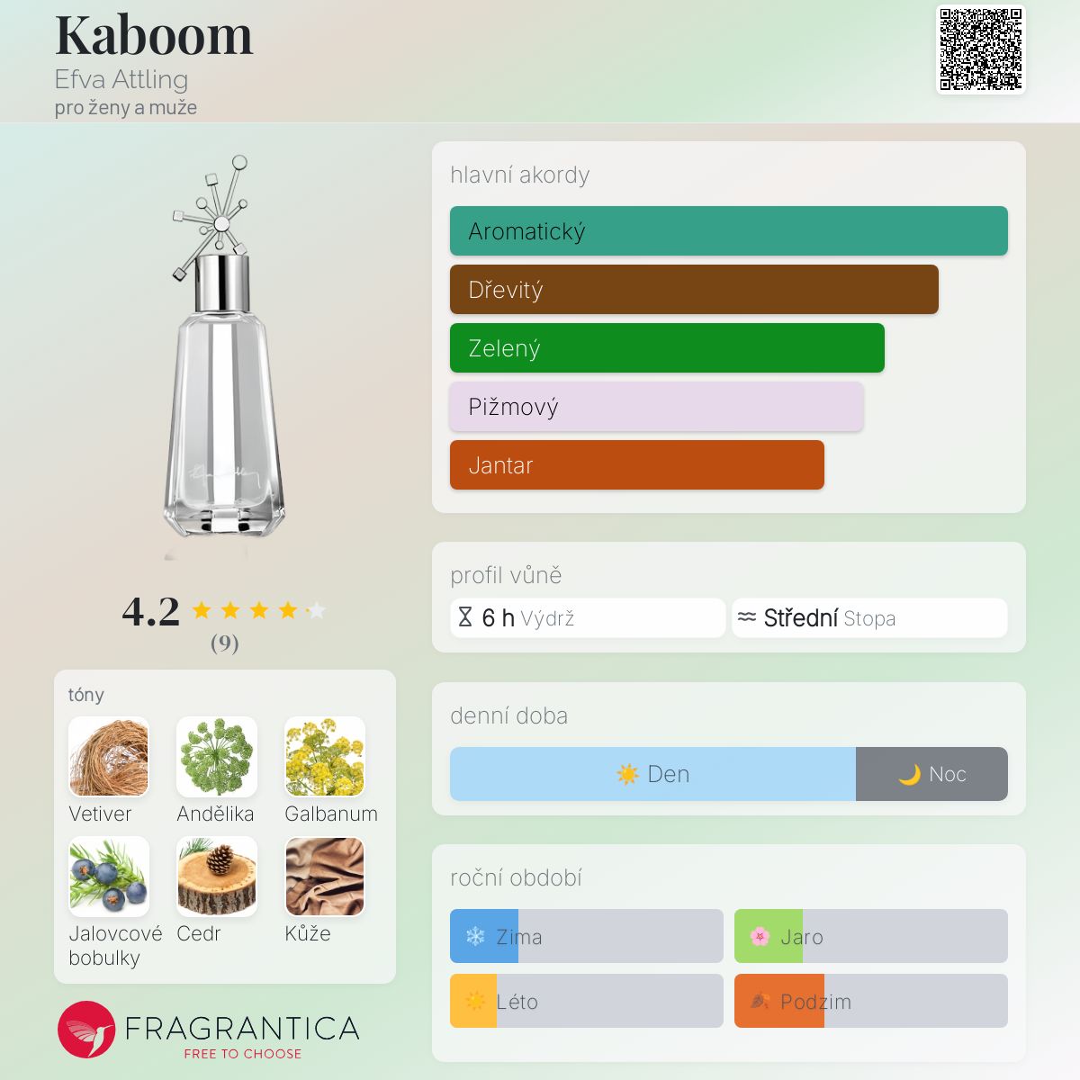 Kaboom podle Efva Attling je Orientální Woody vůně pro ženy a muže. Vrchní tóny jsou Andělika a Jalovcové bobulky; střední tóny jsouGalbanum a Jasmín Sambac ; základní tóny jsou Haitský vetiver, Cedr a Kůže.