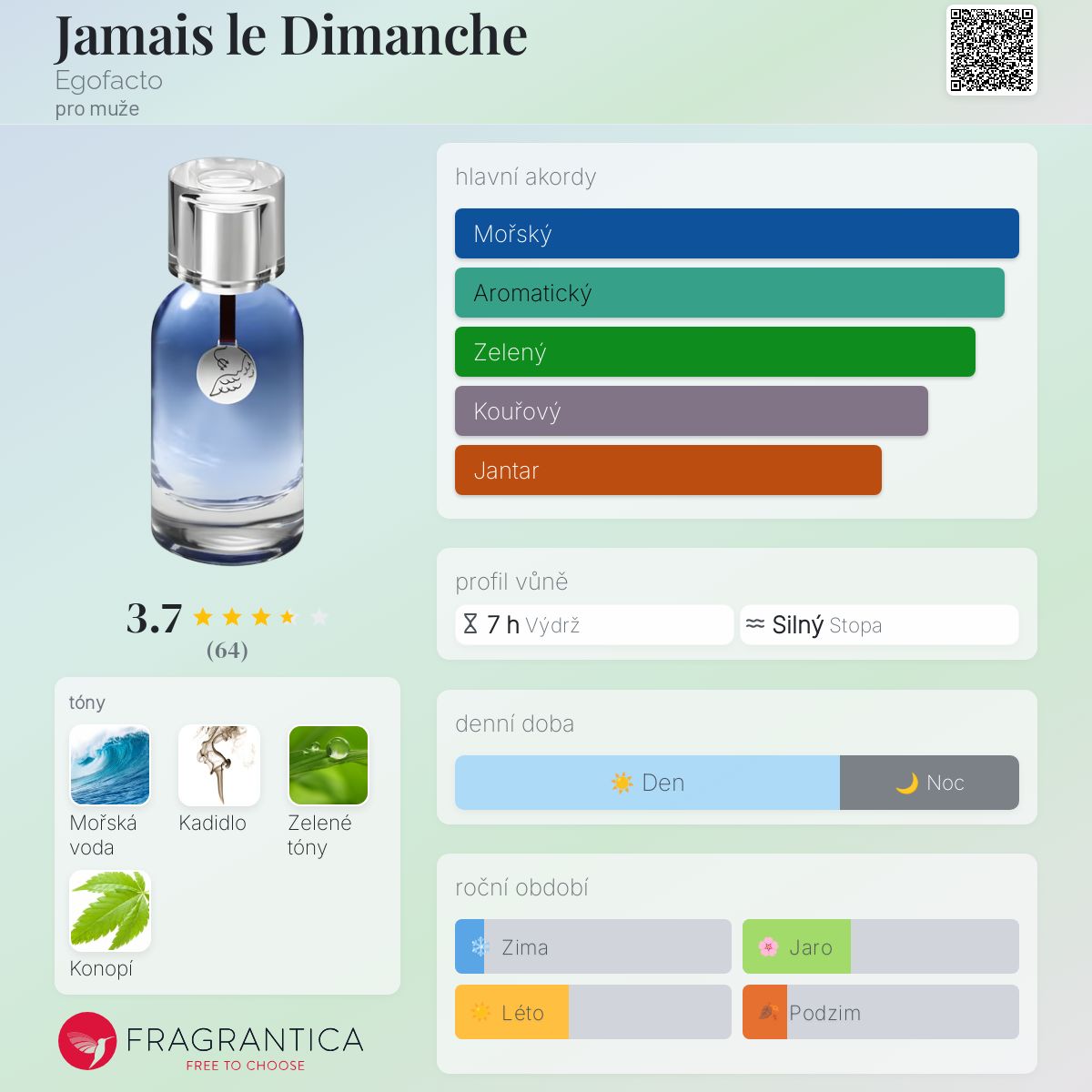 Jamais le Dimanche podle Egofacto je Aromatic Spicy vůně pro muže. Jamais le Dimanche byl/a uveden/a v roce 2009. "Nosem" za touto vůní je Alberto Morillas. Vrchní tóny jsou Mořské tóny a Zelené tóny; střední tón jeKonopí ; základní tón je Kadidlo.