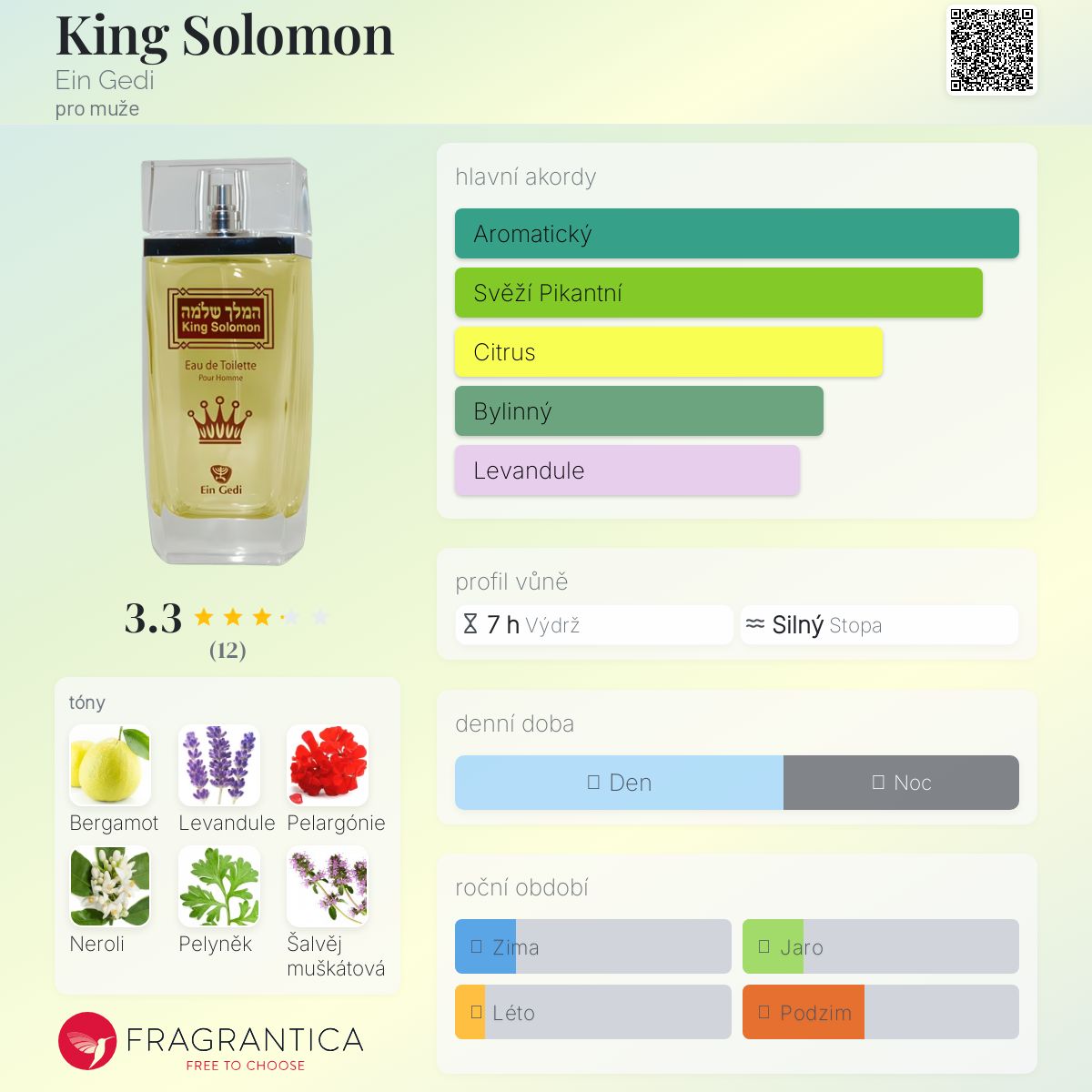 King Solomon podle Ein Gedi je vůně pro muže. Vrchní tóny jsou Bergamot, Pelyněk, Citrón, Bazalka, Koriandr, Rozmarýn a Kůže; střední tóny jsouLevandule, Pelargónie, Neroli, Šalvěj muškátová a Hřebíček ; základní tóny jsou Santalové dřevo, Pačuli, Dubový mech, Jantar (ambra), Kadidlo, Tabák a Pižmo.