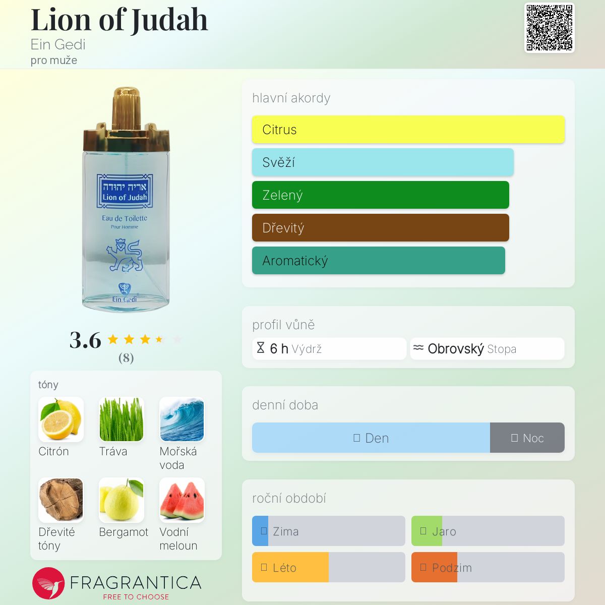 Lion of Judah podle Ein Gedi je vůně pro muže. Vrchní tóny jsou Citrón, Tráva, Bergamot a Vodní meloun; střední tóny jsouMořské tóny, Magnólie a Brambořík ; základní tóny jsou Bílé dřevo, Jantar (ambra) a Pižmo.