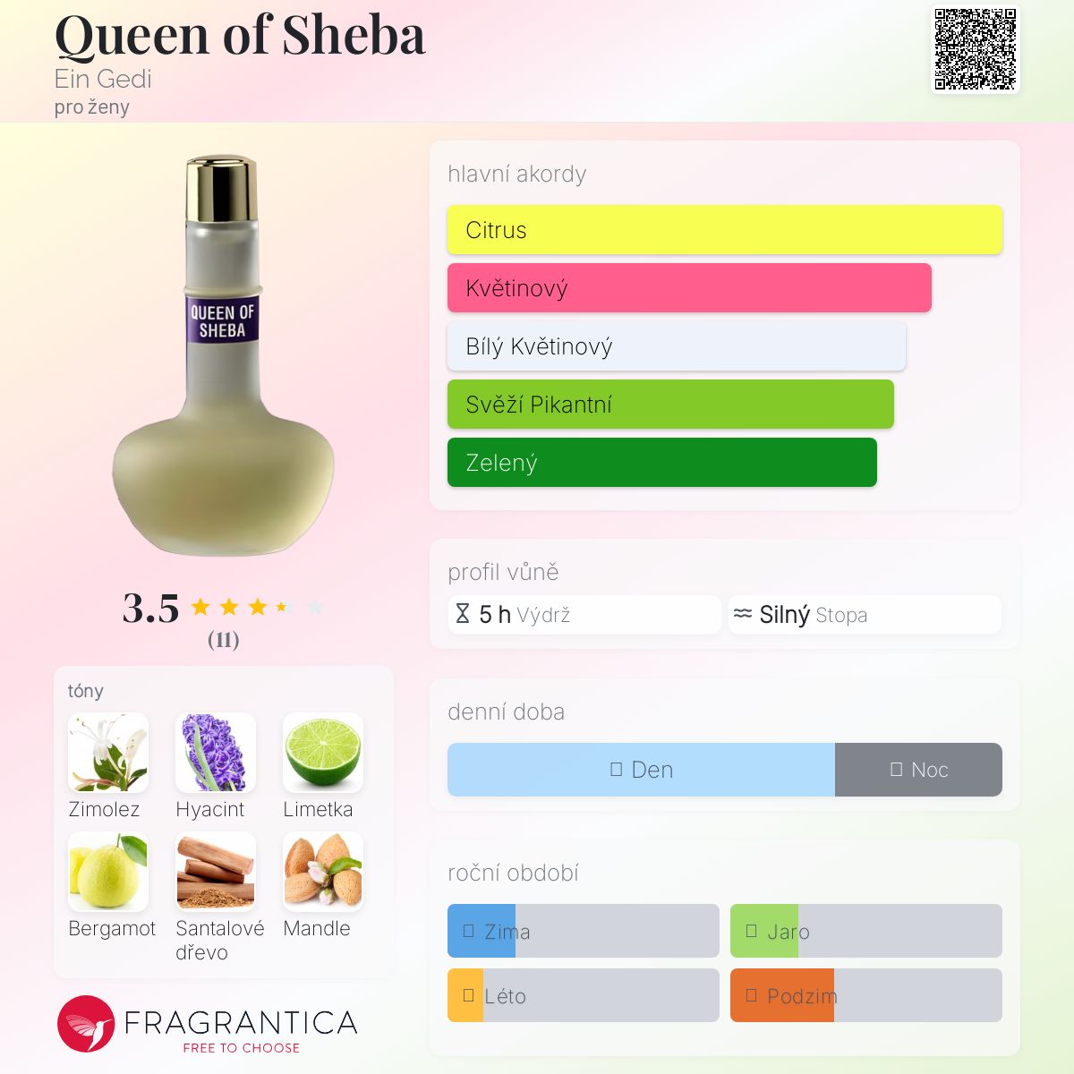 Queen of Sheba podle Ein Gedi je vůně pro ženy. Vrchní tóny jsou Limetka, Bergamot, Neroli a Fialkový list; střední tóny jsouZimolez, Hyacint, Fialka a Růže ; základní tóny jsou Santalové dřevo, Mandle, Pižmo a Dubový mech.