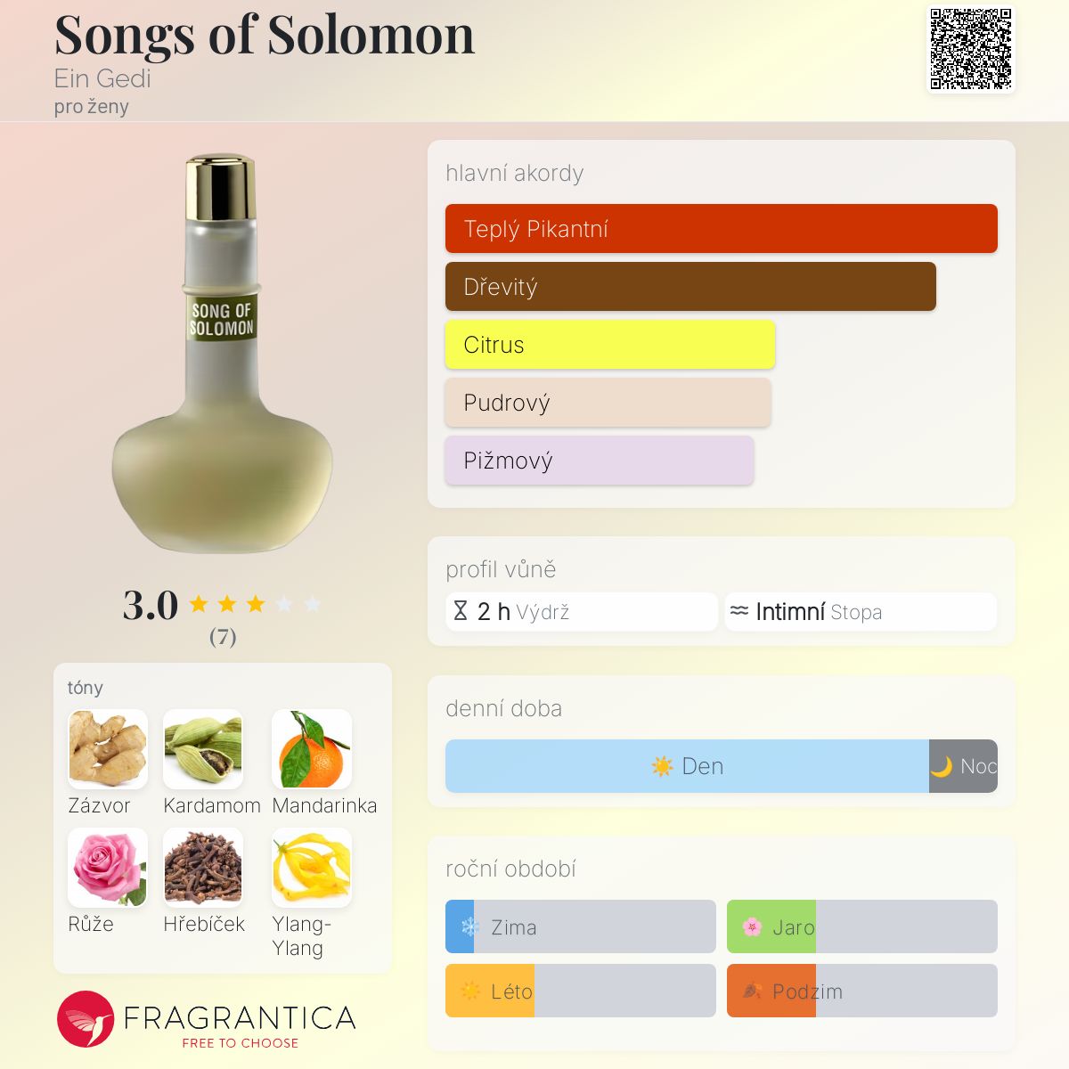 Songs of Solomon podle Ein Gedi je vůně pro ženy. Vrchní tóny jsou Zázvor, Kardamom a Mandarinka; střední tóny jsouRůže, Hřebíček, Ylang-Ylang a Muškátový oříšek ; základní tóny jsou Cedr, Guajakové dřevo, Kadidlo, Pačuli, Vanilka a Pižmo.