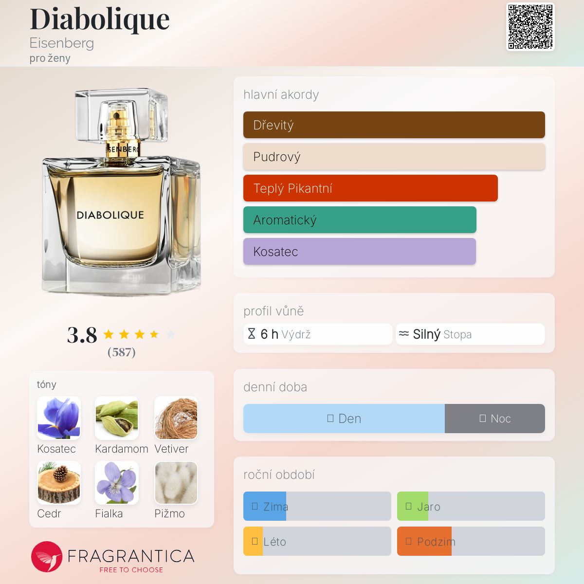 Diabolique podle Eisenberg je Orientální vůně pro ženy. Diabolique byl/a uveden/a v roce 2010. Vrchní tóny jsou Kardamom a Mandarinka; střední tóny jsouKosatec, Virginský cedr, Fialka, Otočník a Jasmín ; základní tóny jsou Vetiver, Pižmo, Santalové dřevo a Benzoin.