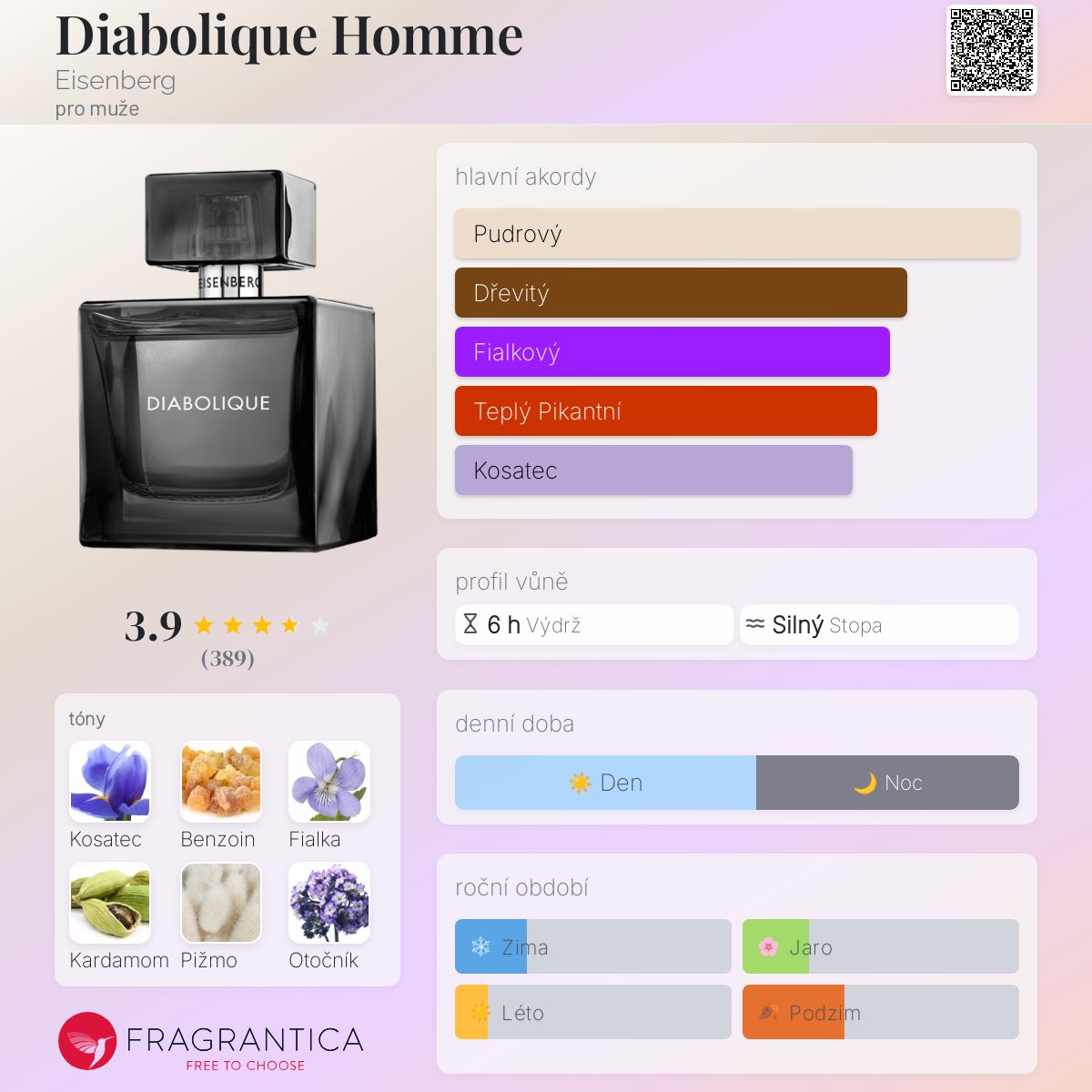 Diabolique Homme podle Eisenberg je Orientální vůně pro muže. Diabolique Homme byl/a uveden/a v roce 2010. Vrchní tóny jsou Kardamom a Mandarinka; střední tóny jsouKosatec, Fialka, Otočník, Virginský cedr a Jasmín ; základní tóny jsou Benzoin, Pižmo, Vetiver a Santalové dřevo.