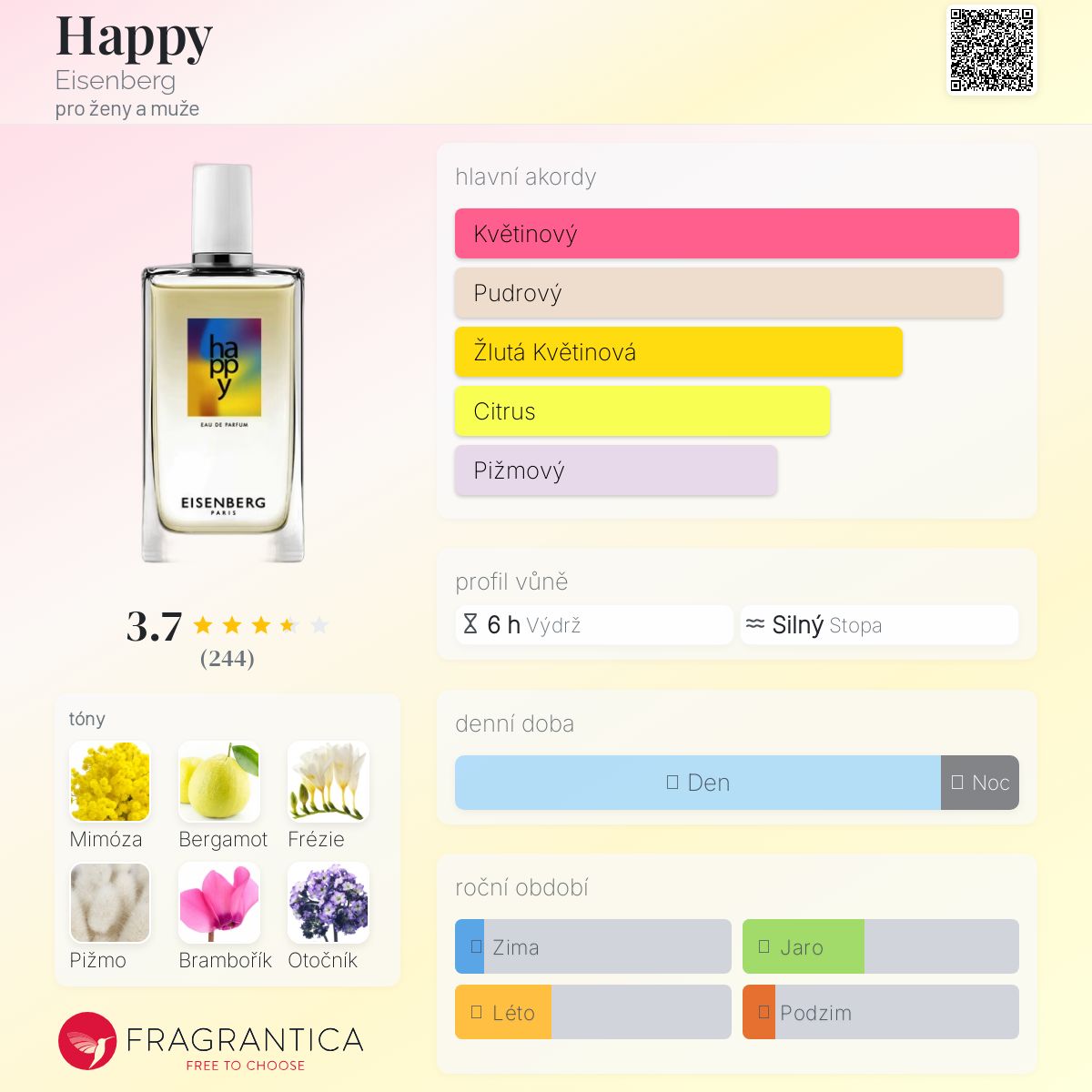 Happy podle Eisenberg je Floral Fruity Gourmand vůně pro ženy a muže. Happy byl/a uveden/a v roce 2022. Vrchní tóny jsou Bergamot a Brambořík; střední tóny jsouMimóza, Frézie a Jasmín ; základní tóny jsou Otočník, Pižmo a Santalové dřevo.