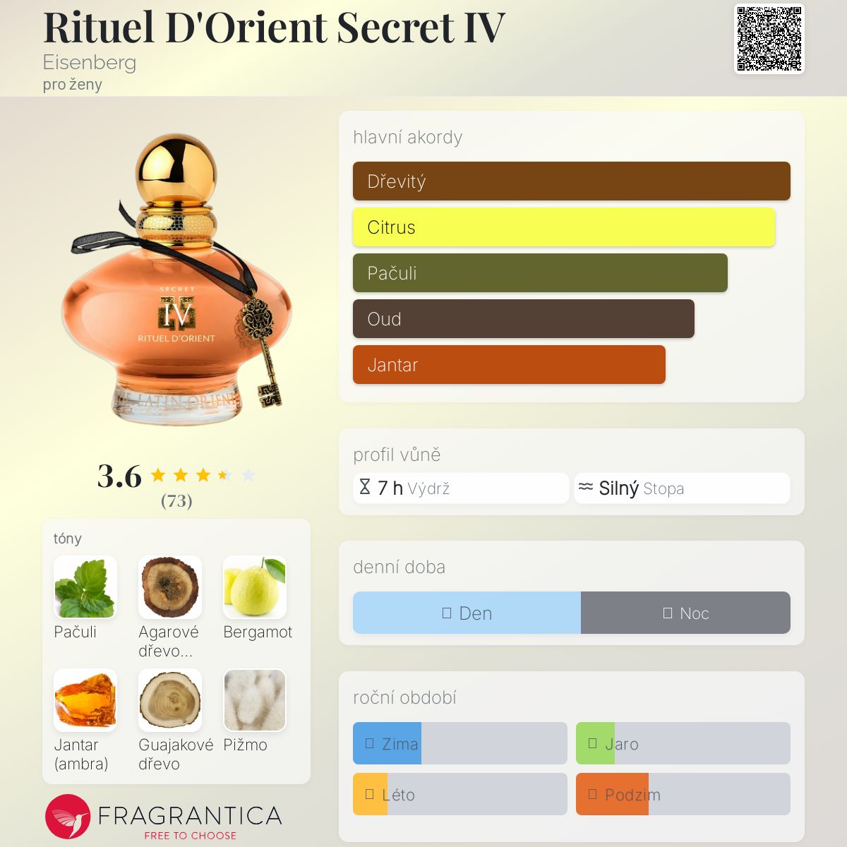 Rituel D'Orient Secret IV podle Eisenberg je Orientální vůně pro ženy. Rituel D'Orient Secret IV byl/a uveden/a v roce 2017. Vrchní tóny jsou Bergamot a Citrón; střední tóny jsouAgarové dřevo (oud), Jasmín a Růže ; základní tóny jsou Pačuli, Jantar (ambra), Guajakové dřevo, Pižmo a Vanilka.