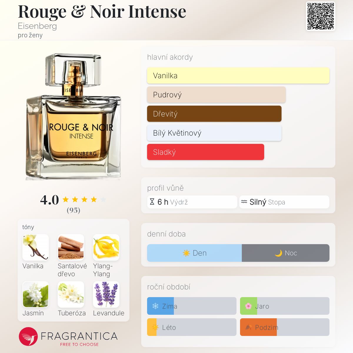 Rouge & Noir Intense podle Eisenberg je Floral Fruity vůně pro ženy. Rouge & Noir Intense byl/a uveden/a v roce 2023. Vrchní tóny jsou Levandule, Bergamot a Mandarinka; střední tóny jsouVanilka a Jasmín ; základní tóny jsou Santalové dřevo, Ylang-Ylang, Tuberóza a Pižmo.
