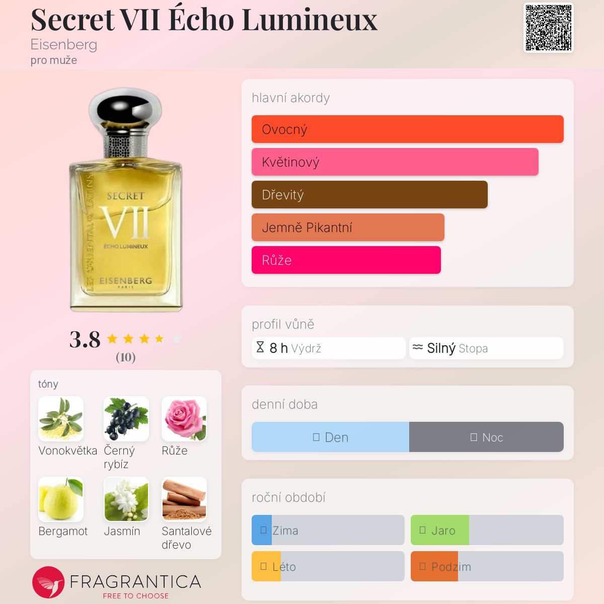 Secret VII Écho Lumineux podle Eisenberg je Chypre Floral vůně pro muže. Toto je nová vůně. Secret VII Écho Lumineux byl/a uveden/a v roce 2024. Vrchní tóny jsou Černý rybíz a Bergamot; střední tóny jsouVonokvětka, Růže a Jasmín ; základní tóny jsou Santalové dřevo, Pačuli, Pižmo a Mech.