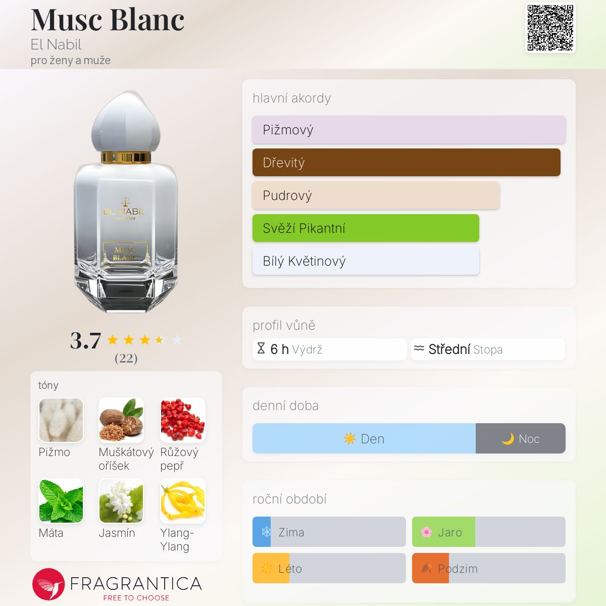 Musc Blanc podle El Nabil je Floral Woody Musk vůně pro ženy a muže. Vrchní tóny jsou Muškátový oříšek, Růžový pepř a Pikantní máta; střední tóny jsouJasmín, Ylang-Ylang, Lilie, Cedr, Vetiver, Suché dřevo, Růže a Zázvor ; základní tóny jsou Pižmo, Labdanum, Santalové dřevo, Olibanum a Pačuli.