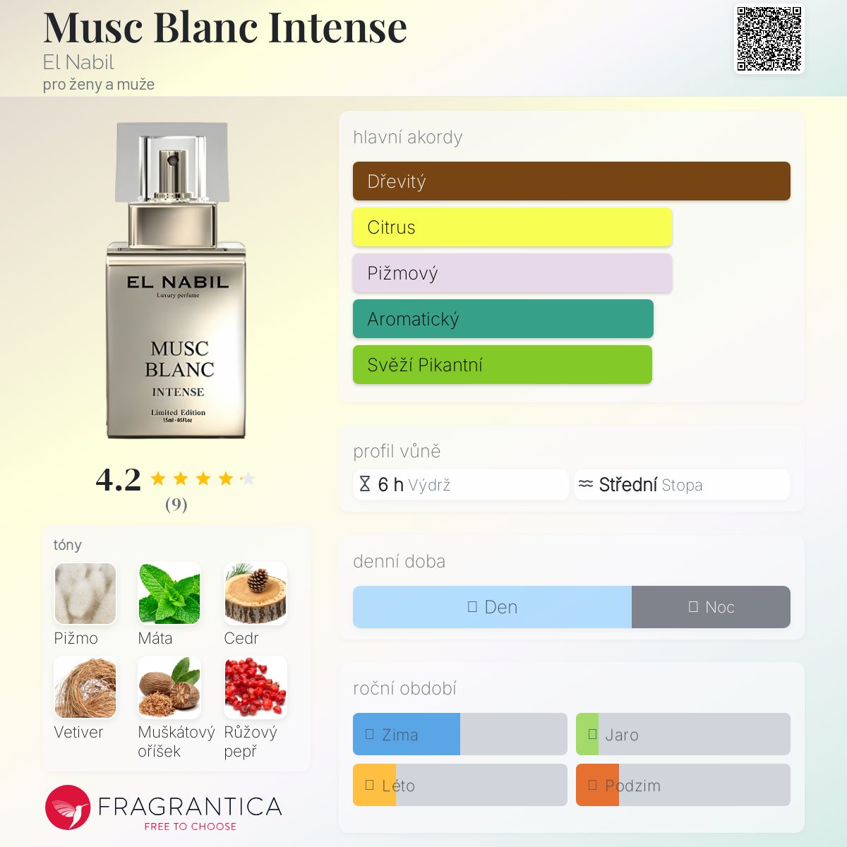 Musc Blanc Intense podle El Nabil je Floral Woody Musk vůně pro ženy a muže. Vrchní tóny jsou Máta, Muškátový oříšek, Růžový pepř, Pomeranč, Citrón a Grapefruit; střední tóny jsouCedr, Vetiver, Jasmín, Růže, Lilie, Ylang-Ylang, Zázvor a Suché dřevo ; základní tóny jsou Pižmo, Labdanum, Olibanum, Pačuli a Santalové dřevo.