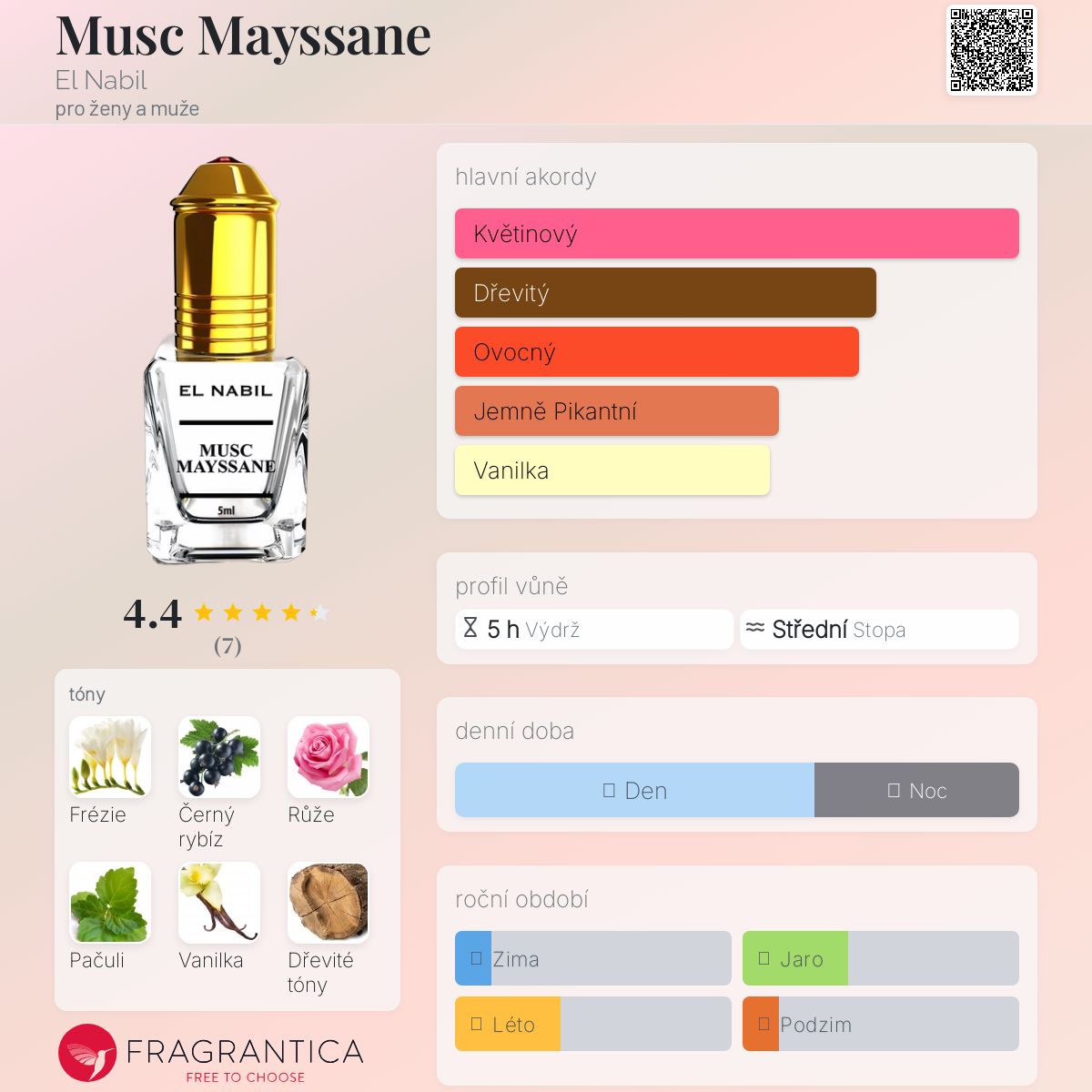 Musc Mayssane podle El Nabil je Floral Fruity vůně pro ženy a muže. Musc Mayssane byl/a uveden/a v roce 2015. Vrchní tóny jsou Frézie a Sirup z černého rybízu; střední tóny jsouRůže a Pačuli ; základní tóny jsou Vanilka, Bílé dřevo a Ambroxan.