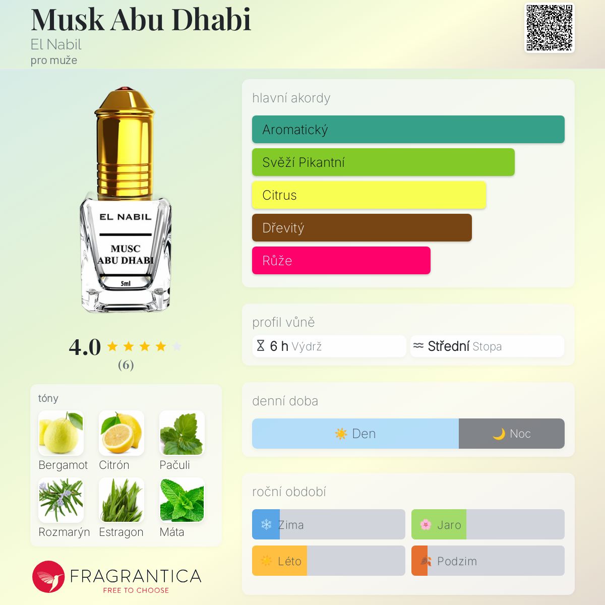 Musk Abu Dhabi podle El Nabil je Woody Aromatic vůně pro muže. Vrchní tóny jsou Bergamot, Citrón, Rozmarýn a Estragon; střední tóny jsouMáta, Růže, Jalovec a Pelargónie ; základní tóny jsou Pačuli, Vanilka, Santalové dřevo a Bílé pižmo.