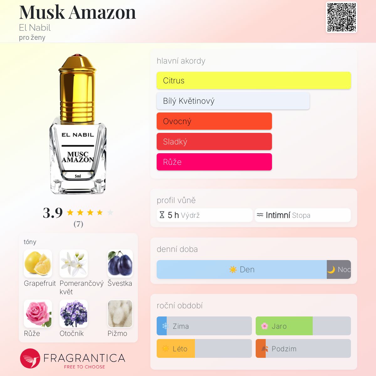 Musk Amazon podle El Nabil je Floral Fruity vůně pro ženy. Vrchní tóny jsou Grapefruit a Švestka; střední tóny jsouPomerančový květ, Růže a Otočník ; základní tóny jsou Pižmo, Vanilka, Jantar (ambra) a Cedr.