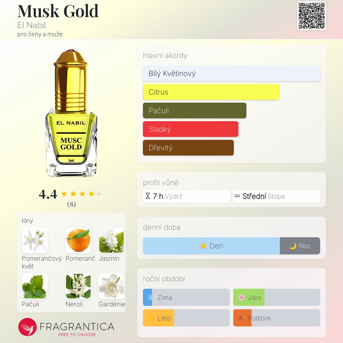 Musk Gold podle El Nabil je Floral Fruity Gourmand vůně pro ženy a muže. Vrchní tóny jsou Pomeranč, Neroli a Maliny; střední tóny jsouPomerančový květ, Jasmín a Gardénie ; základní tóny jsou Pačuli, Sladké tóny a Med.